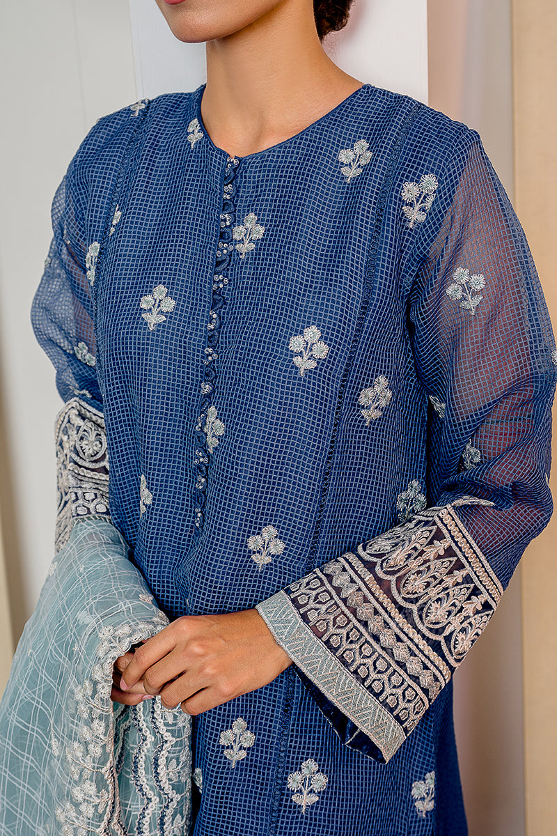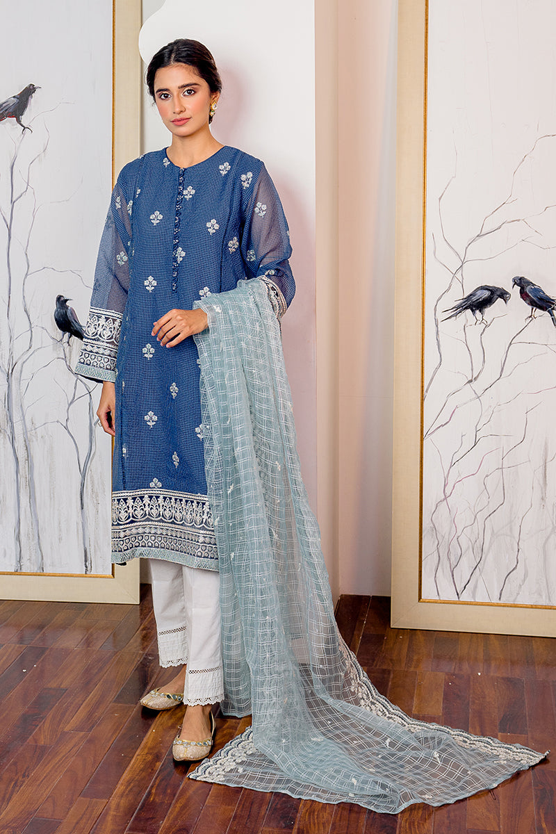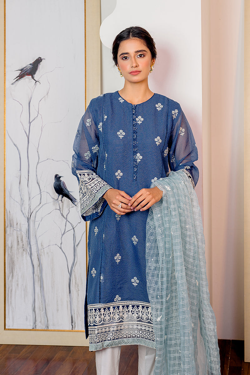 Blue Shirt, Round Neckline with Embellishment, Embroidery on Front and Sleeves, Light Blue Dupatta with Embroidery