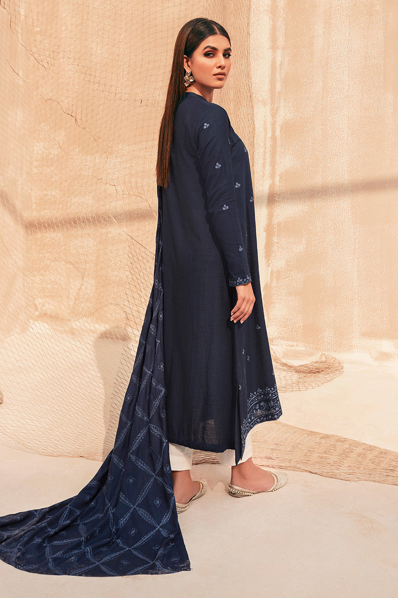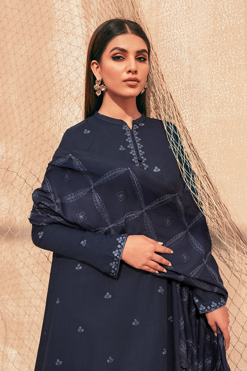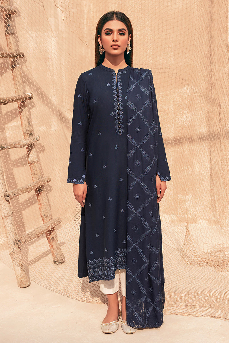 - This Dark blue embroidered khaddar suit is perfect for semiformal winter evenings. Add value to the suit with elaborate diamond studs and blue coat shoes.