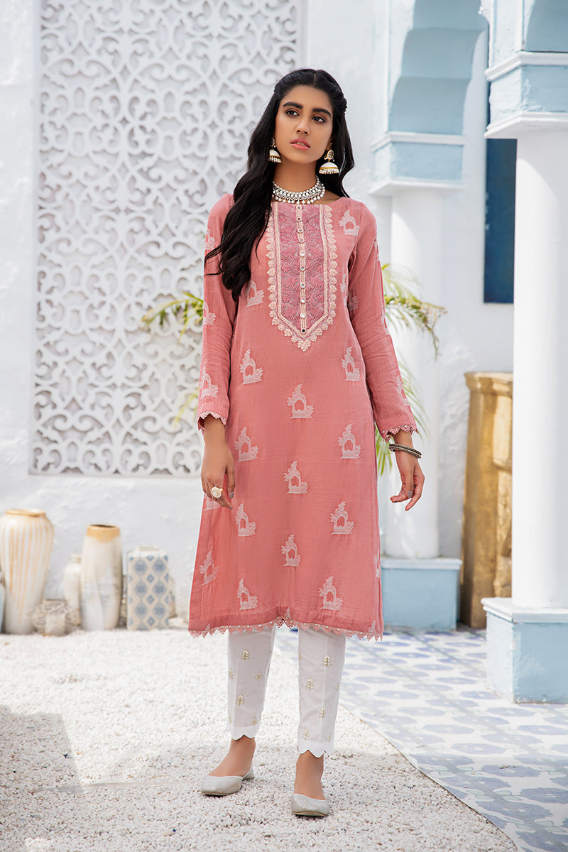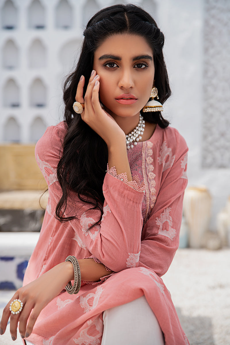 Elegantly Composed in all its Beauty, Roshanay Features Embellished Details on a Jacquard Pink Kurta. Bold Jhumkas and Embellished pants would Top the Look
