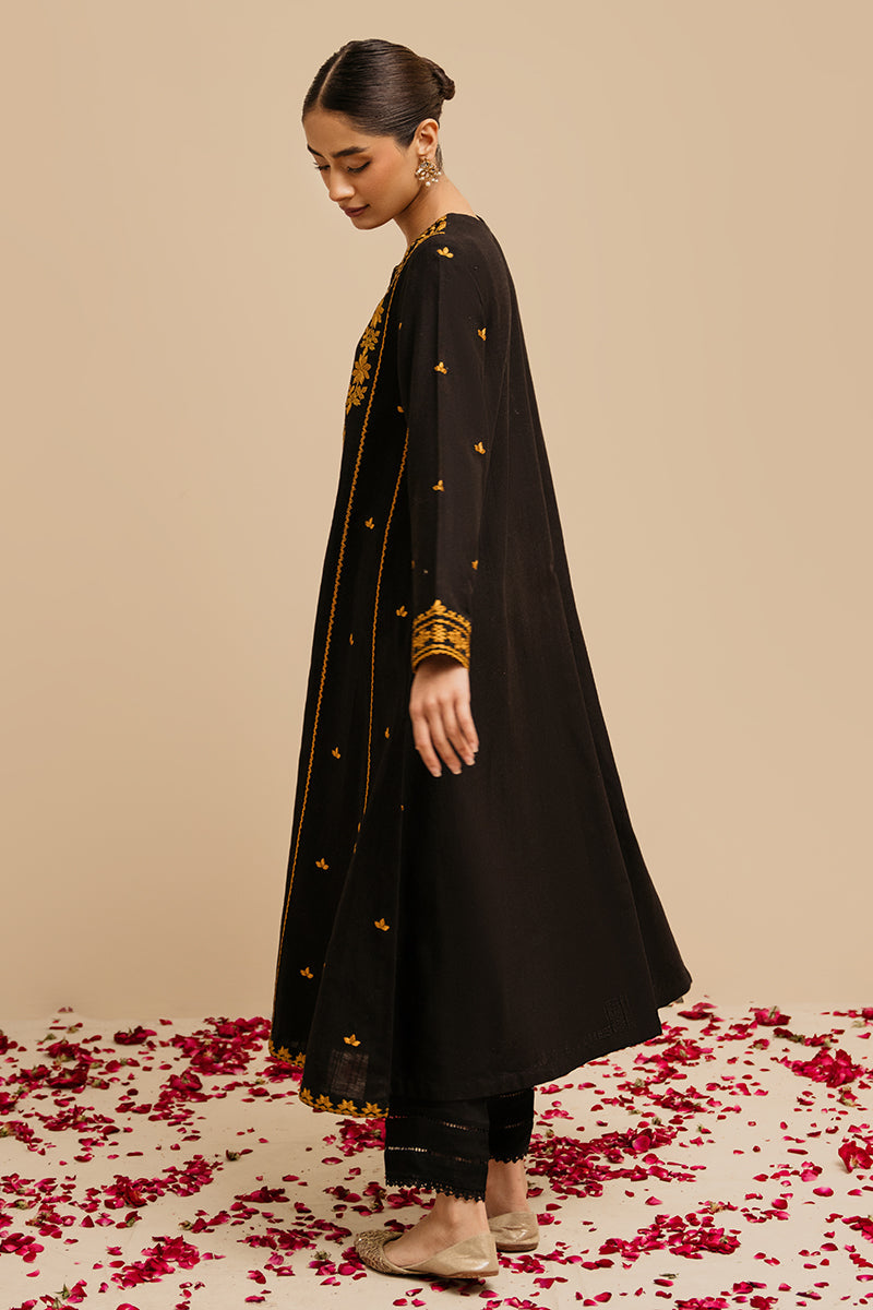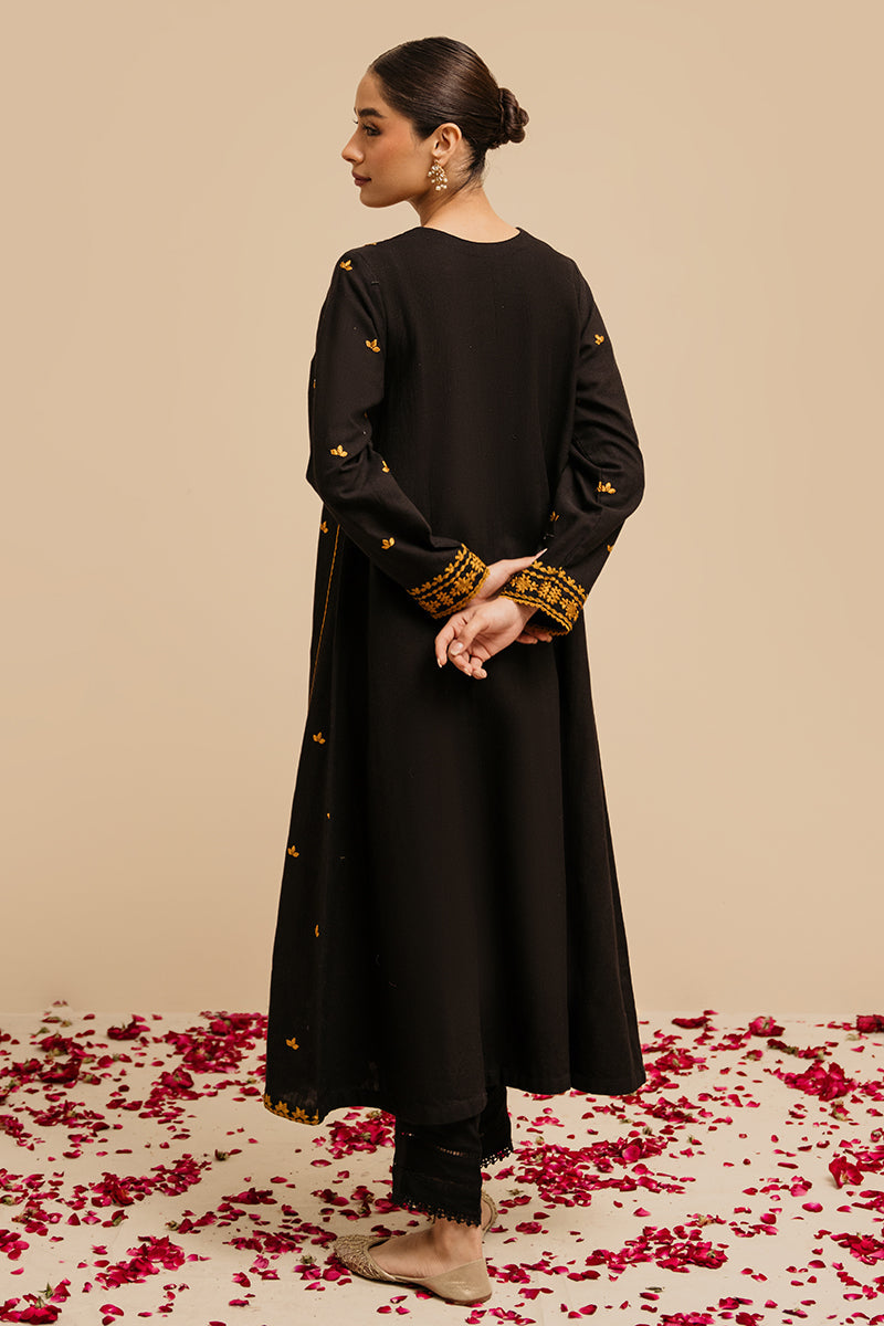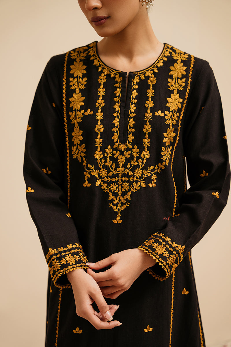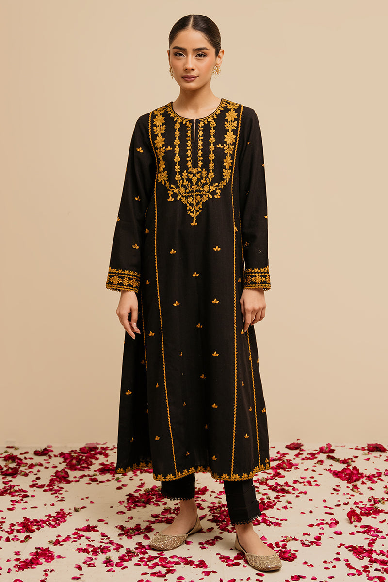 Stay stylish with this winter-ready After Dark A-line Paneled Shirt. Crafted from comfortable and warm Khaddar fabric, it features a round neckline with front embroidered and lace detail. The back is designed in plain dyed finish with embroidered sleeves for a timeless look you will love.