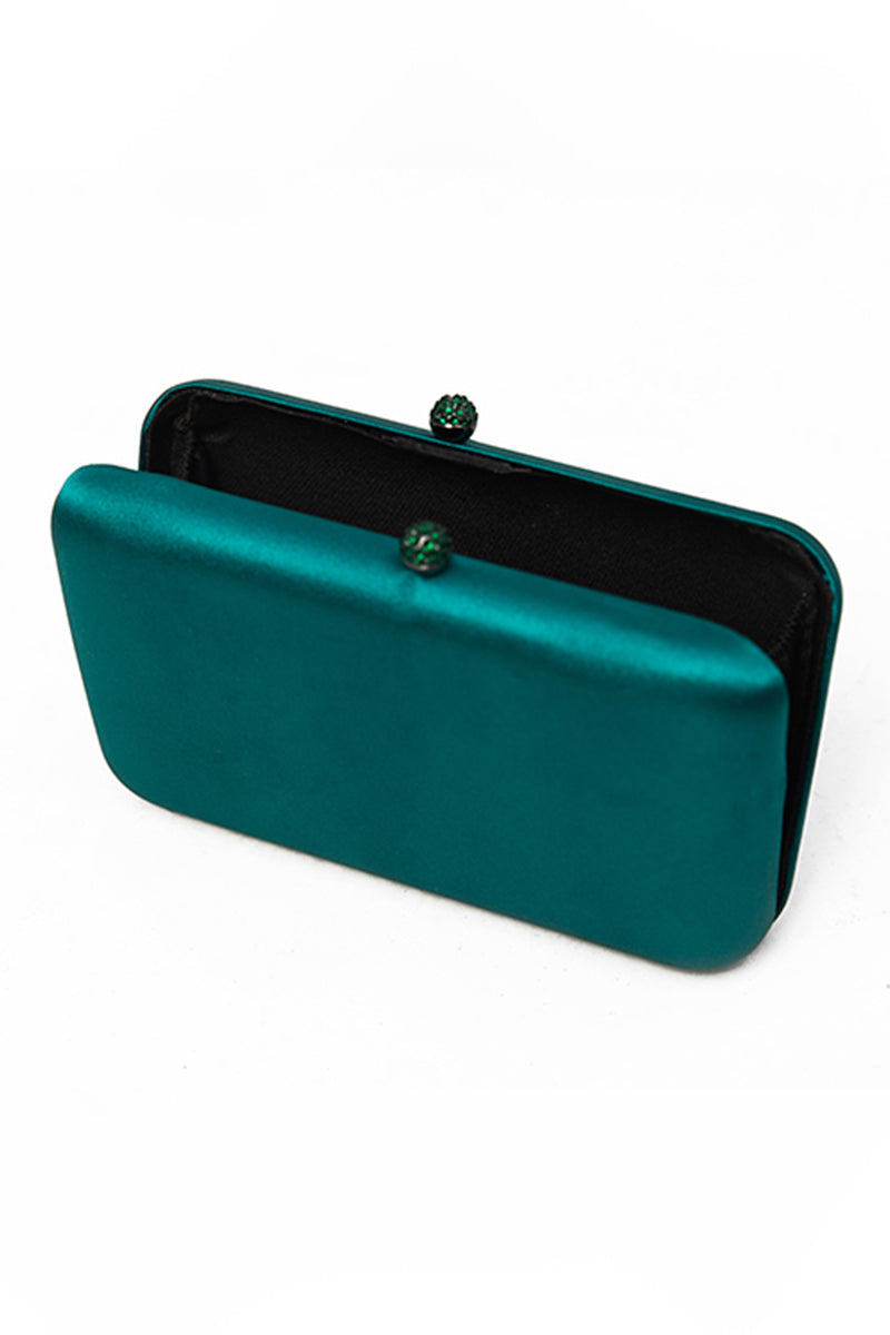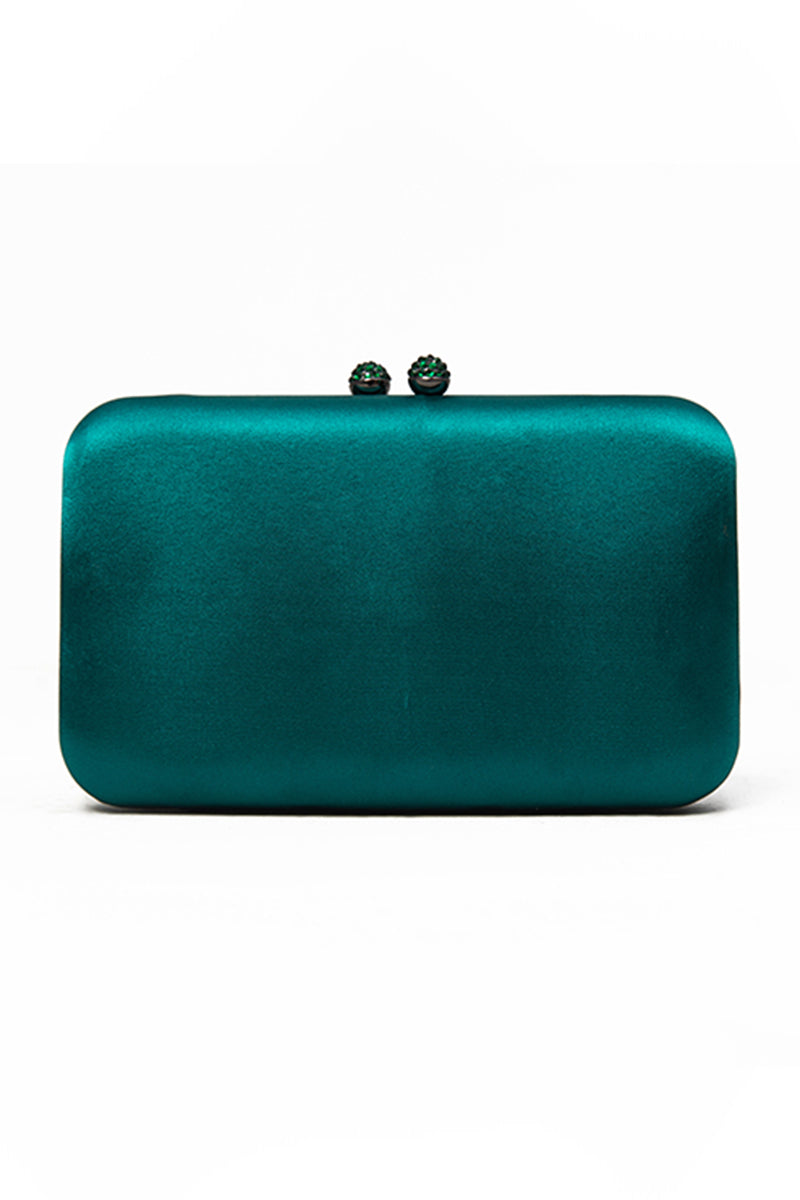 - This clutch is effortlessly glamorous in sleek satin. Cleverly crafted to fit naturally in your hand, this compact minaudiere is exquisitely structured with a detachable chain strap and features a spacious interior for all of your day or night essentials. A timeless piece, complemented with a ball clasp decorated with pearls and crystals.