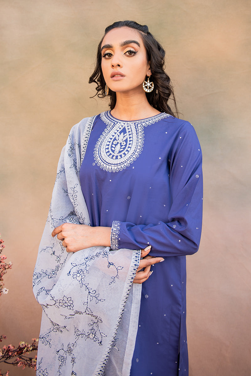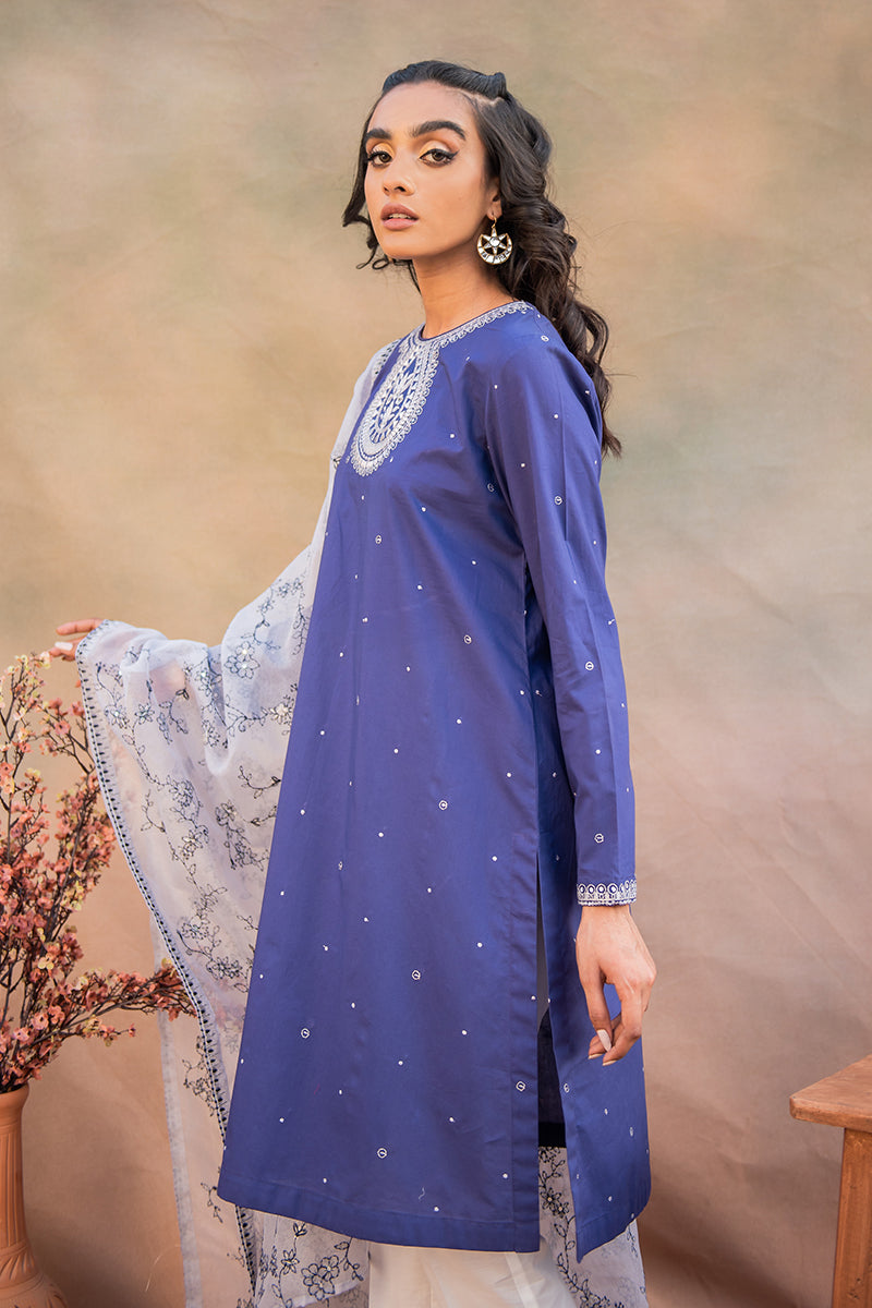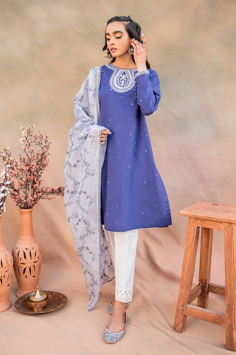 - Beautiful lapis toned kurta embellished with intricate sequin embroidery paired with a sequin embroidered rajjo net dupatta. Style the two piece with embellished trousers and khussas.