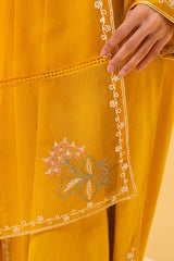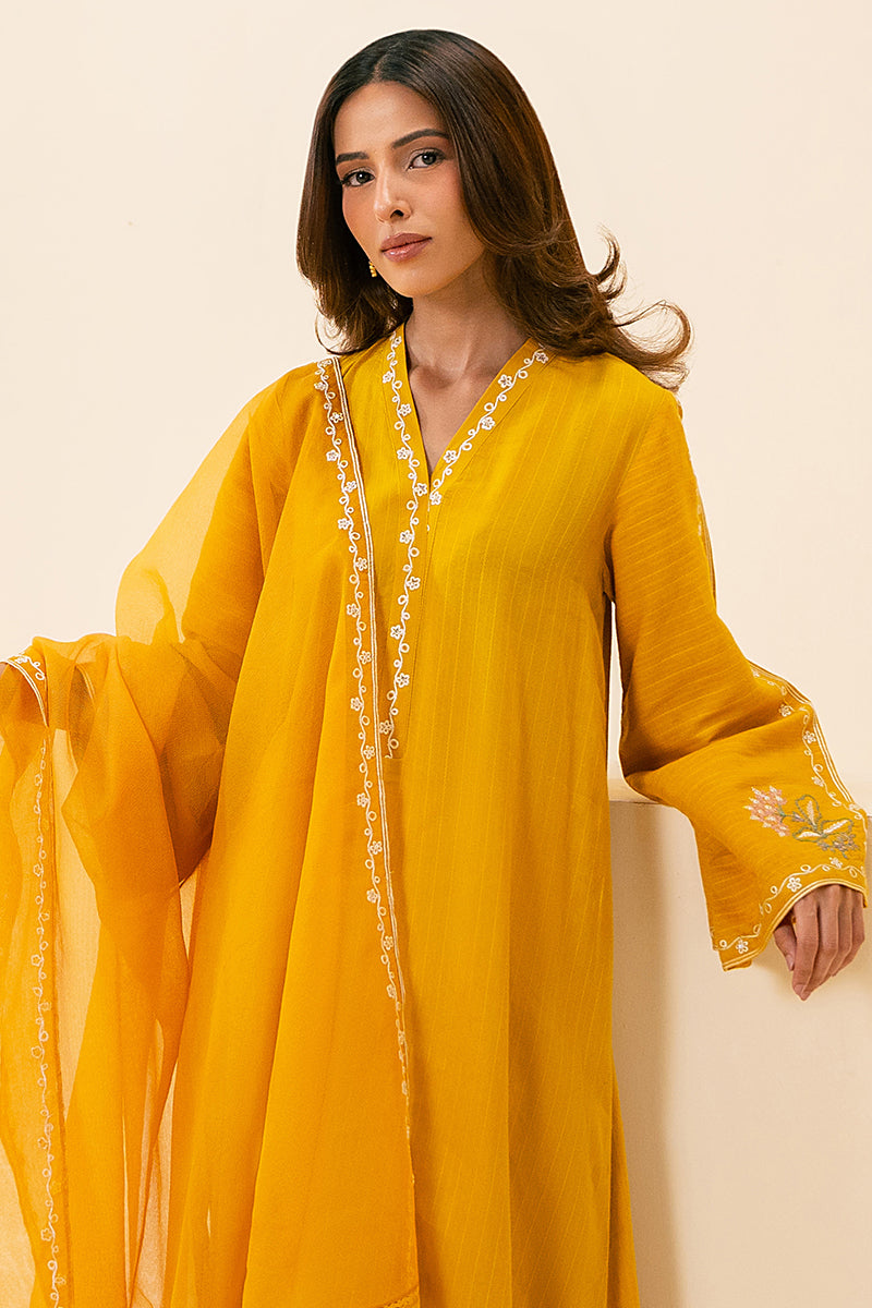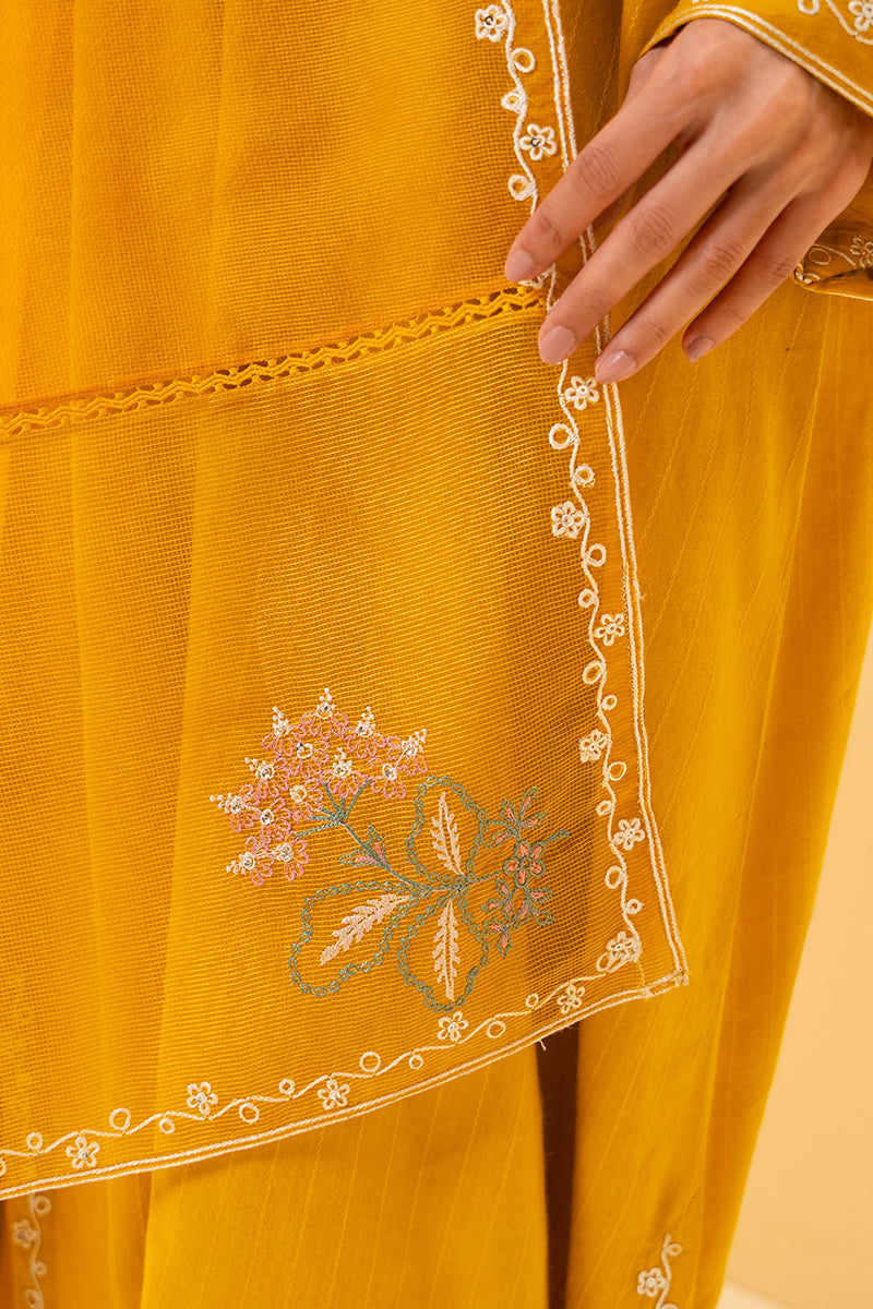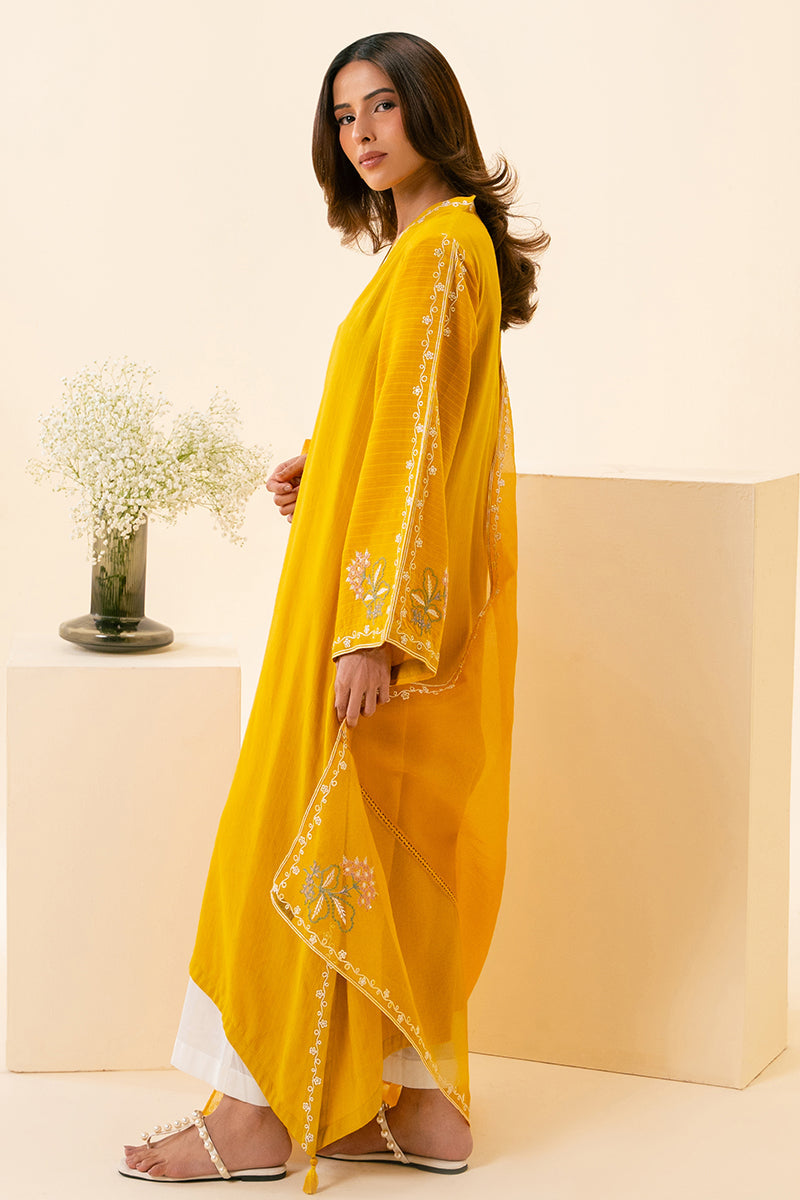 This SHIRT boasts an A-line silhouette with drop corners, crafted from linen. The front and back are both plain dyed and the neckline features embroidered wrap around details. The flared sleeves are also beautifully embroidered. Paired with this is the DUPATTA, a Rajjo net embroidered dupatta.