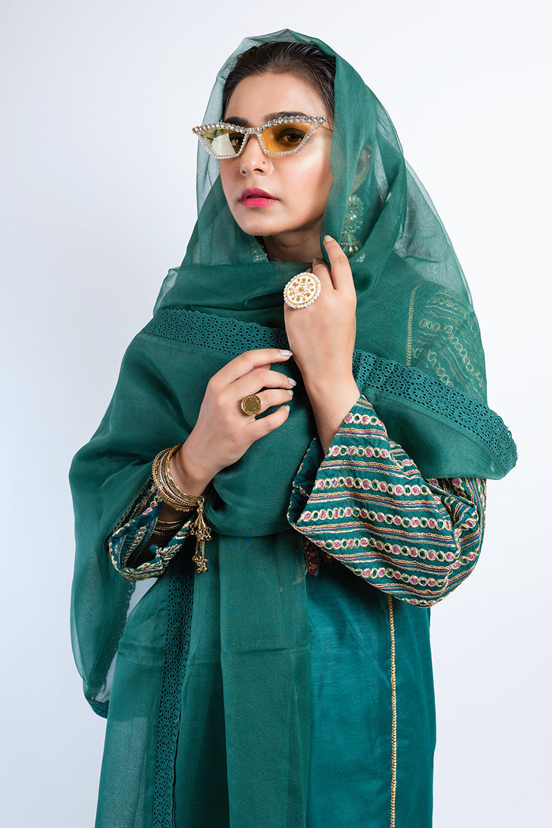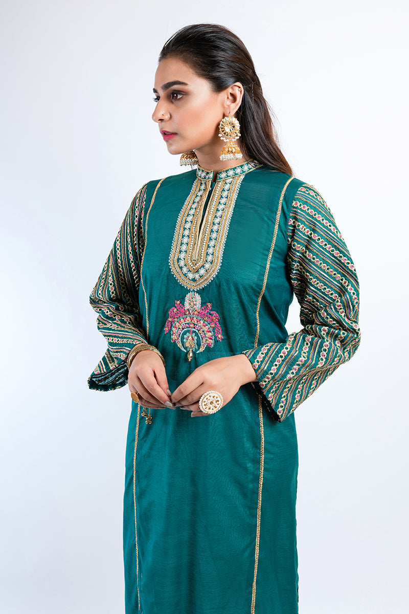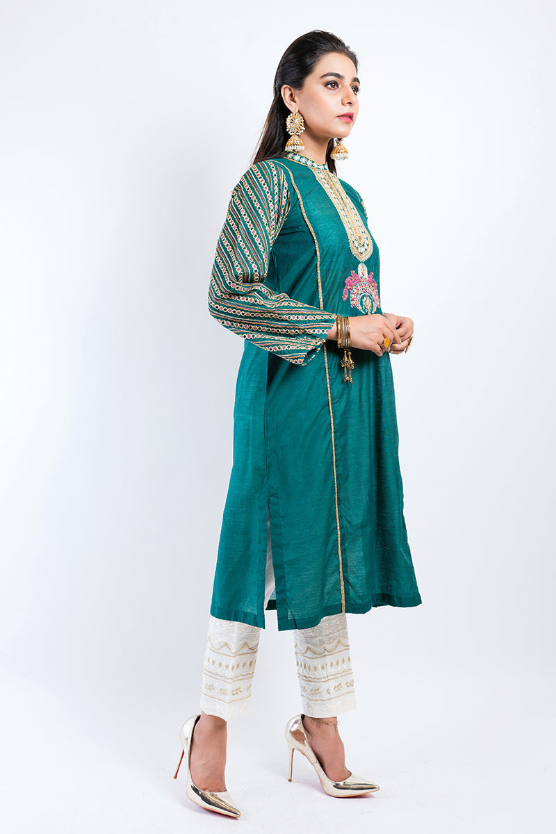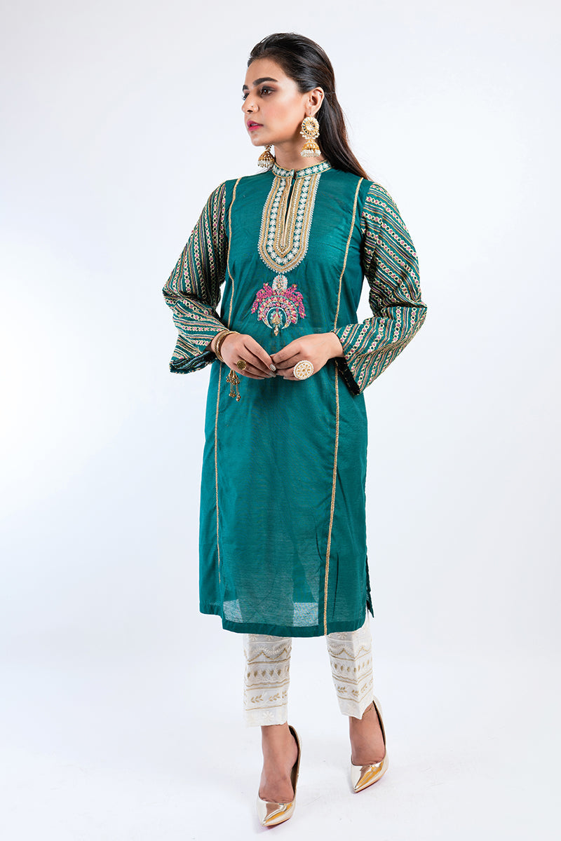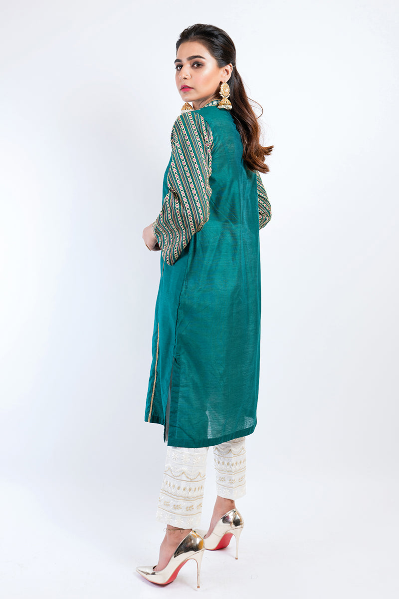 Embellished silk tunic that is your companion for a day affair. Match this piece with a net dupatta of the same color contrast and an embroidered bottom.