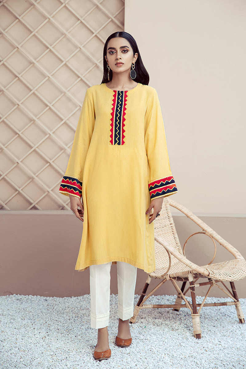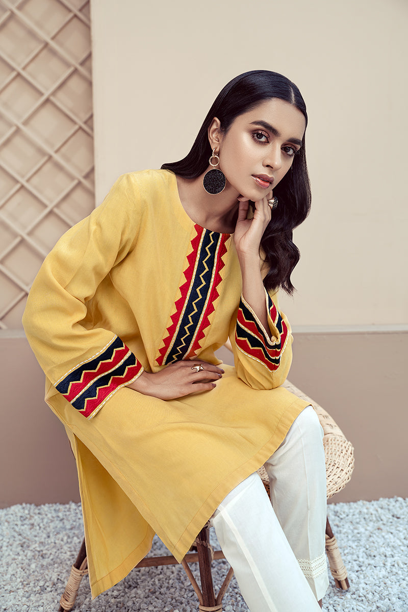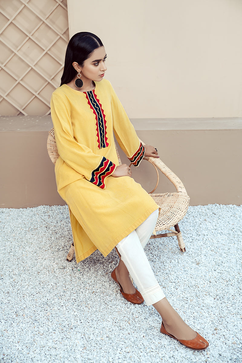 There's never a dull moment in this bright yellow kurta with hints of black and red on the sleeves and neck. Wear black or white straight trousers.