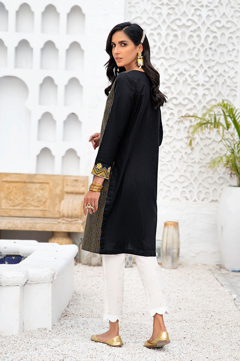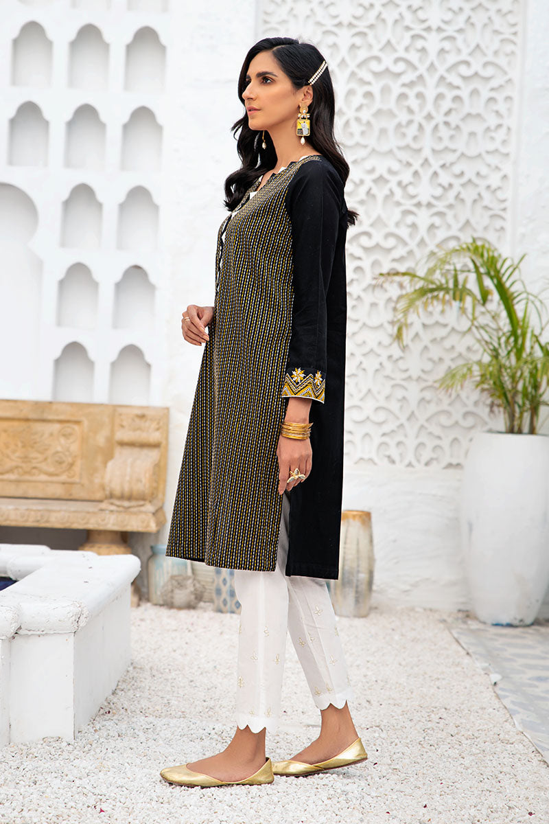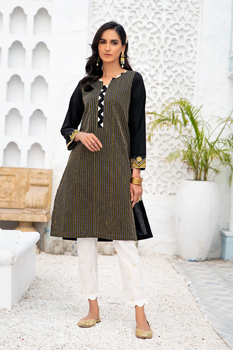 A Modern Silhouette Featuring Black and Gold Embroidered Horizontal Details on the Front with Monochrome Touch on the Neckline. Pair with Black or White Bottom and Gold Toned Accessories