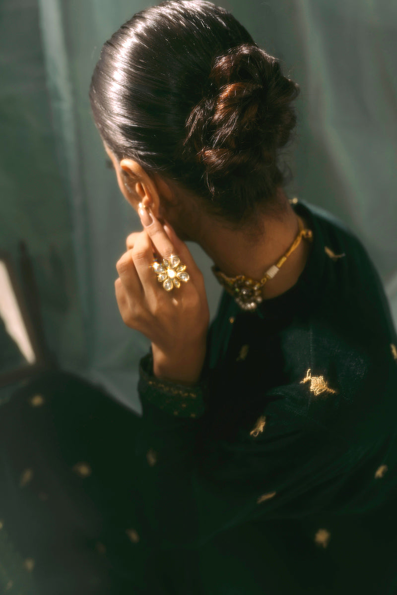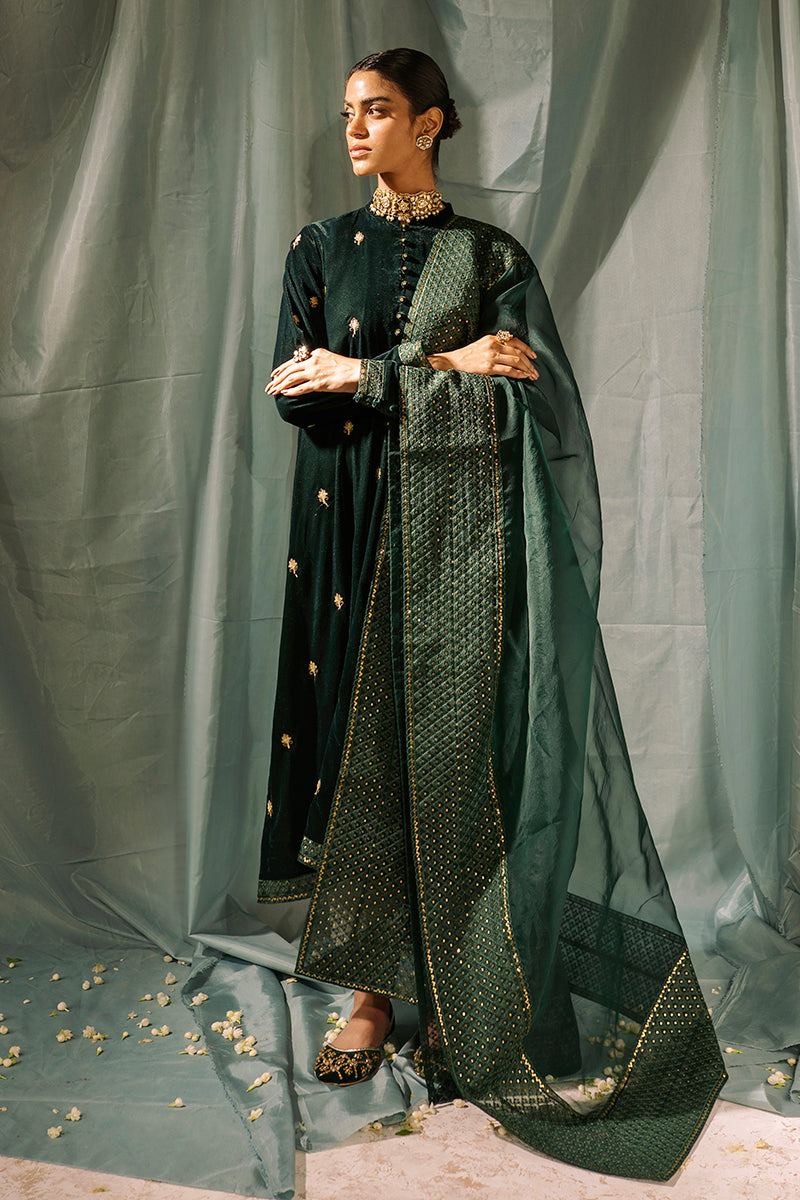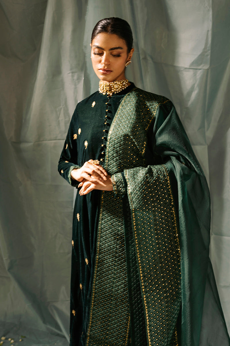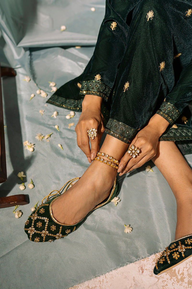 - This deep green embellished suit on a classic velvet canvas will surely make you look dreamy. Pair it with matching green raw silk pants and golden khussas