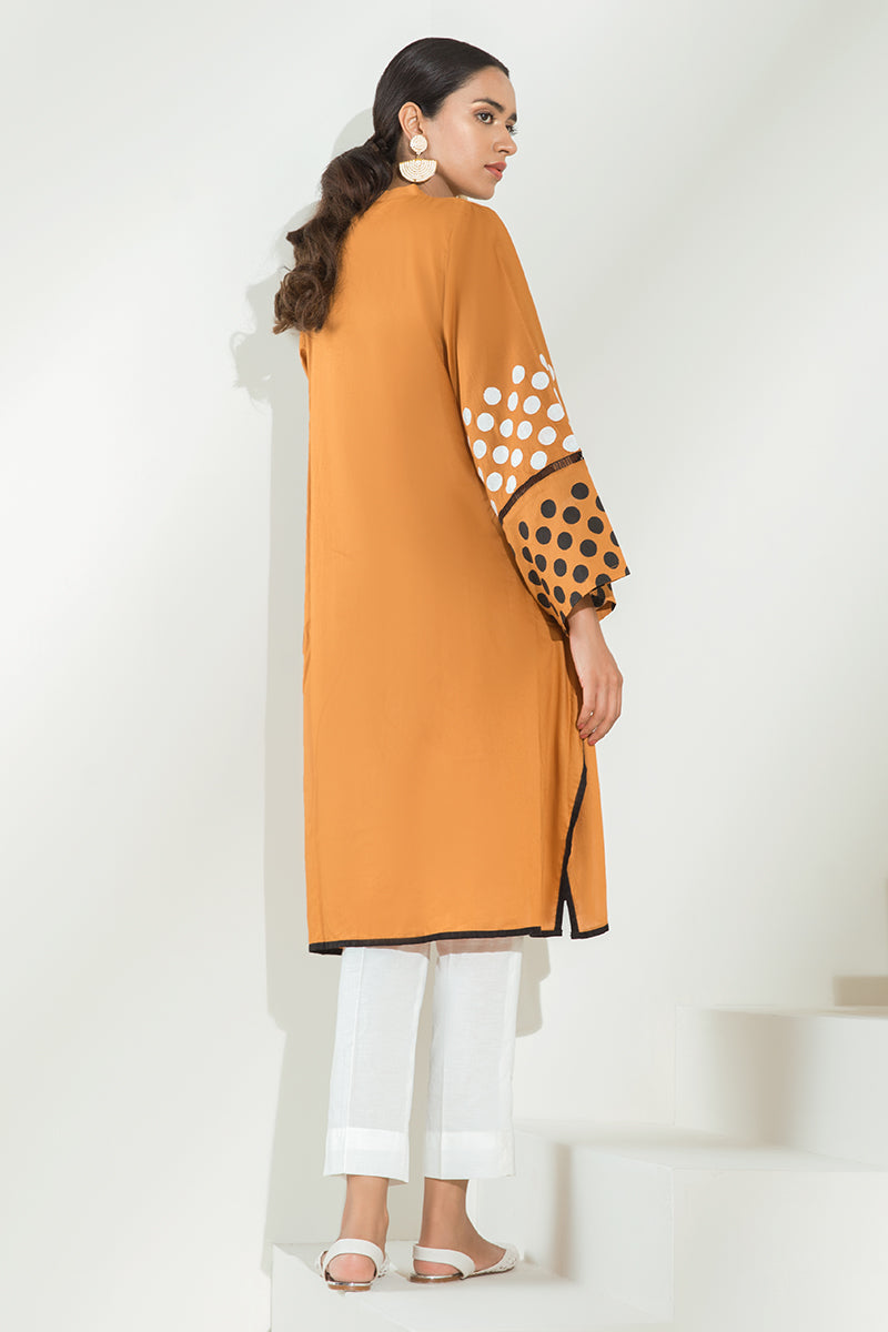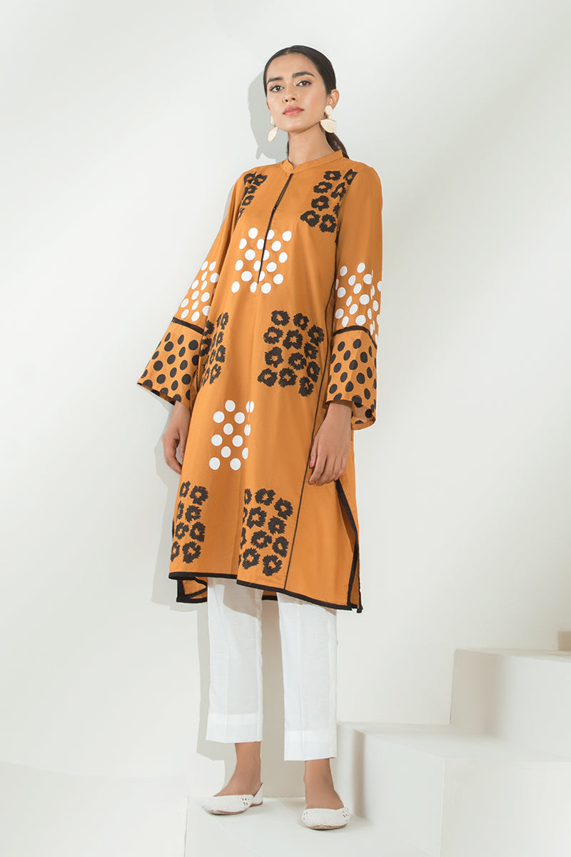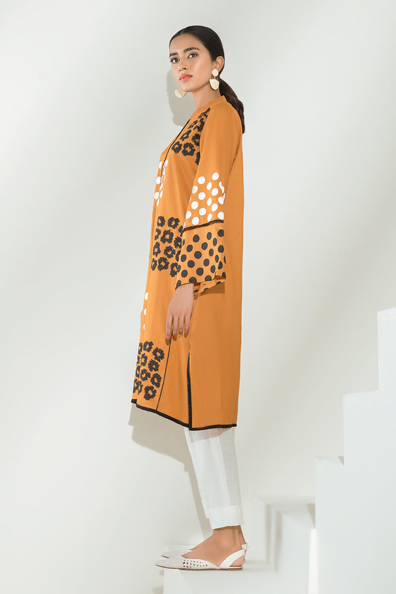 Shades of yellow in this top is perfected for daily outdoors. Black or white bottom matches in contrast with the block prints, worn with a subtle up do.