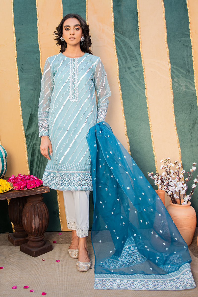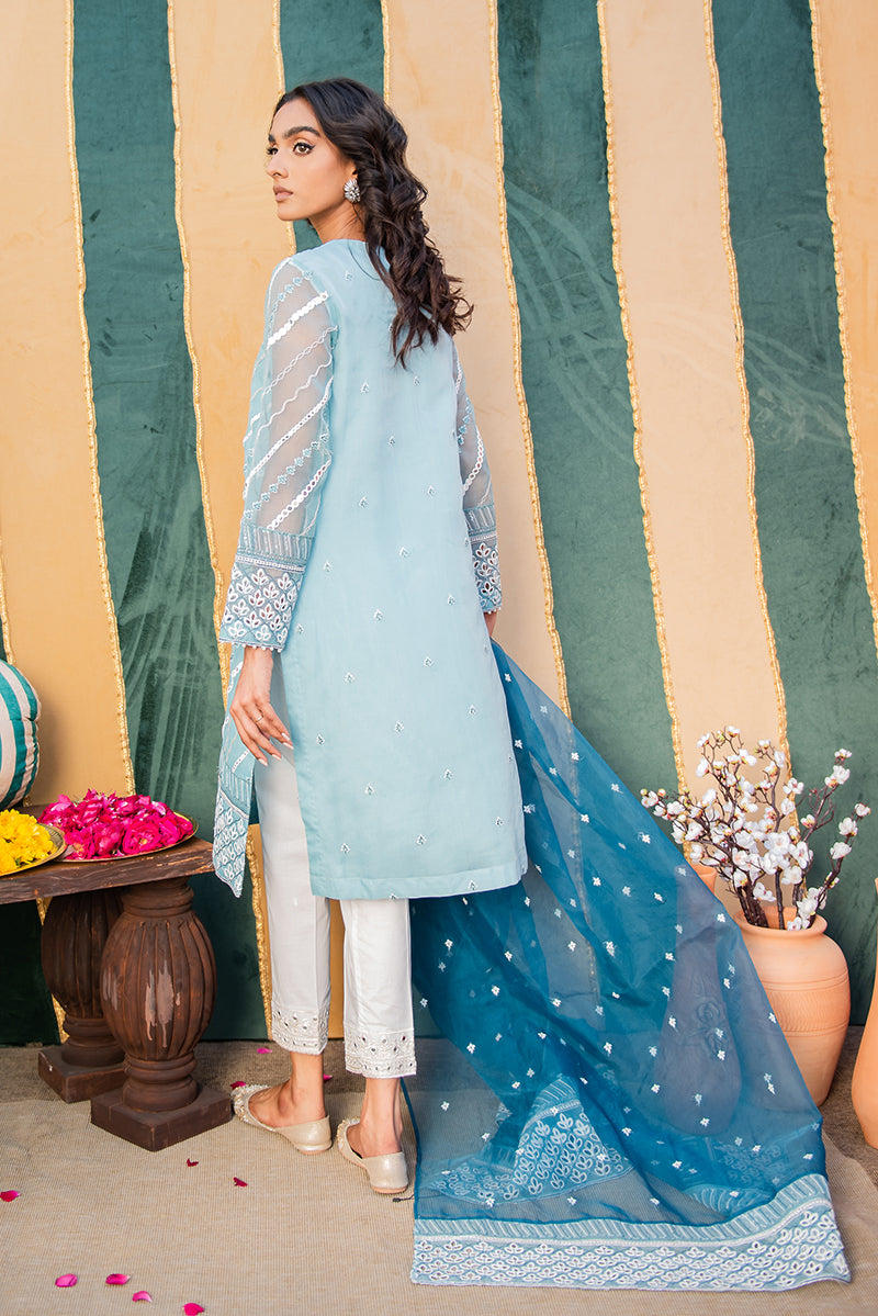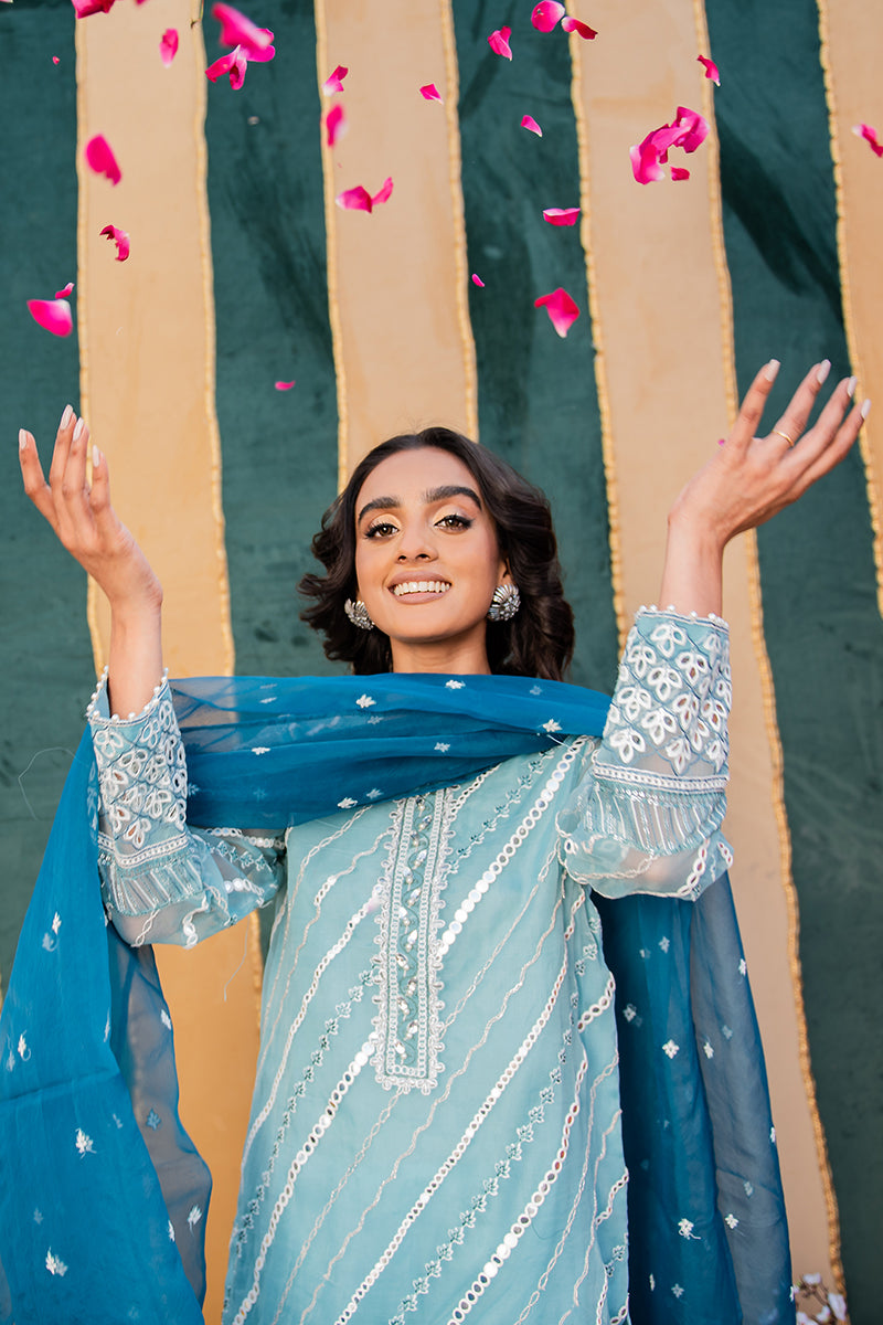Rendered on an aqua blue organza fabric, this aesthetic two-piece outfit reminds of a clear summer sky with sequin embroidery & schiffli borders. The contrasting schffli border organza dupatta takes the attire up a notch styled with embellished bottoms and bold makeup.