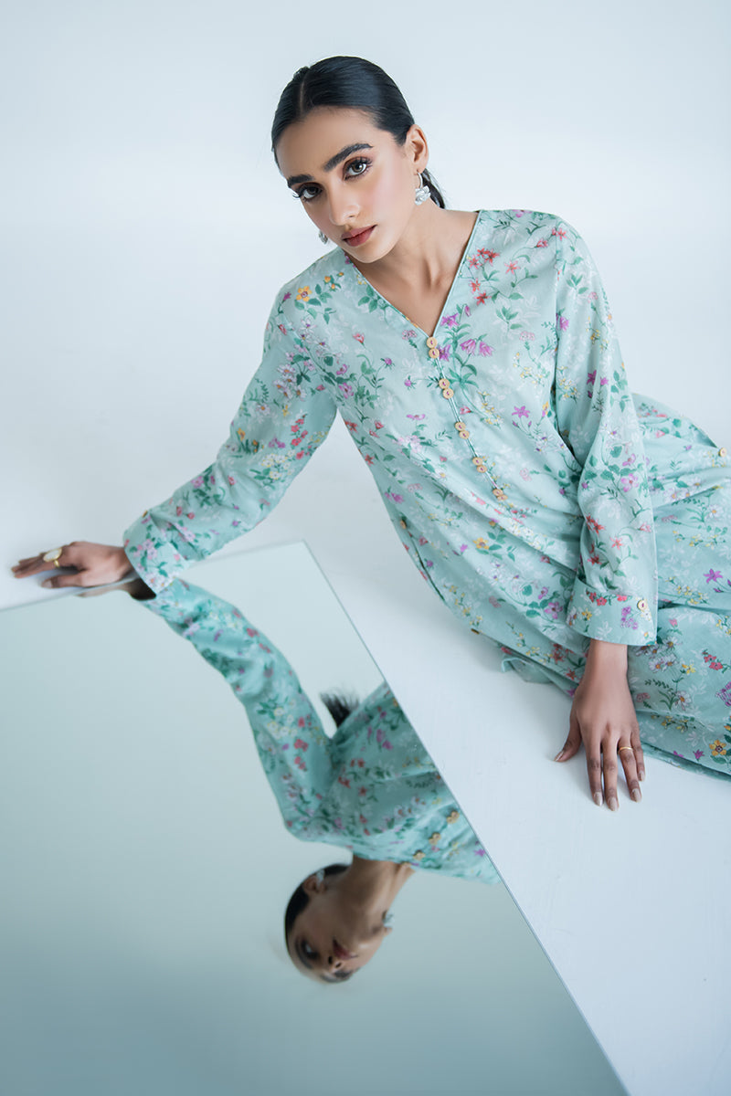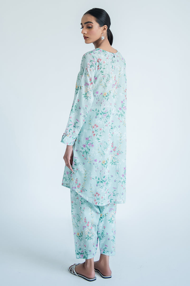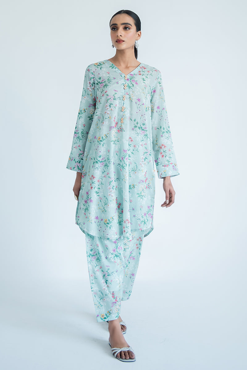 - TRIM AND FLORAL CO-ORD SET WITH A SPRINGY DIGITAL PRINT FEATURING A ROUND HEM KURTA AND SHALWAR. STYLE WITH A LOOSE PONYTAIL AND SILVER STUDS TO MATCH WITH FLORAL PATTERN