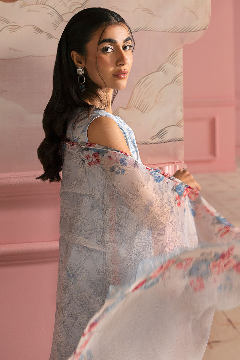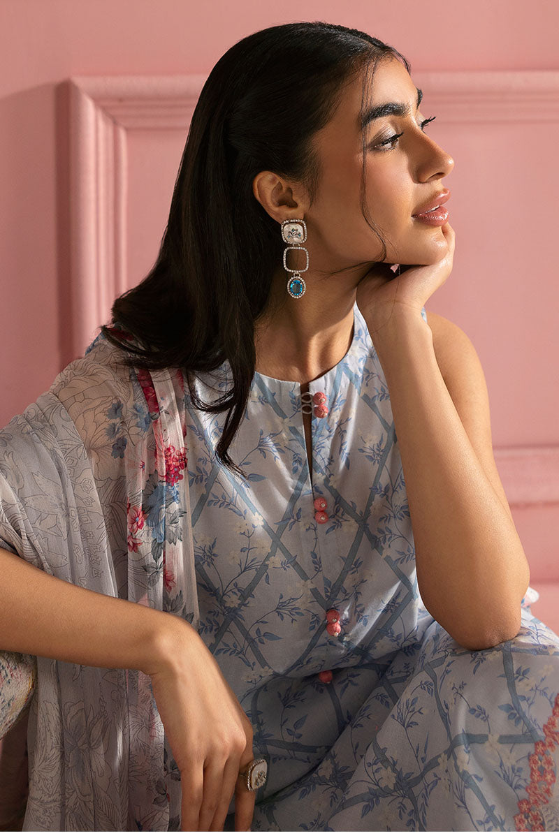 This AQUA ICE-3PC printed lawn suit includes a lawn printed shirt with 40" embroidered patti for the hem and 60" embroidered patti for the sleeves. The cambric dyed trouser and chiffon printed dupatta complete the elegant and stylish ensemble. Elevate your wardrobe with this expertly crafted, high-quality suit.