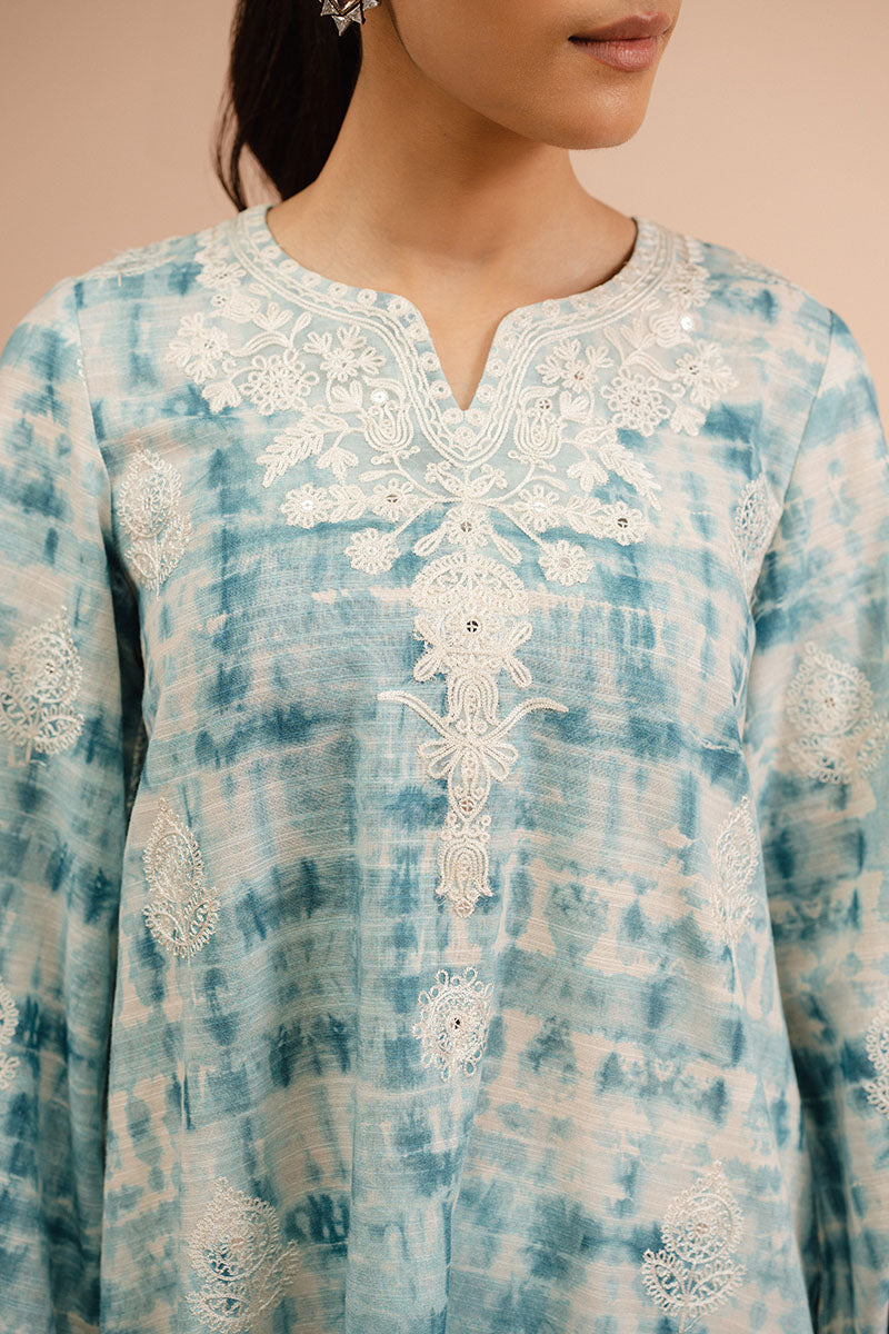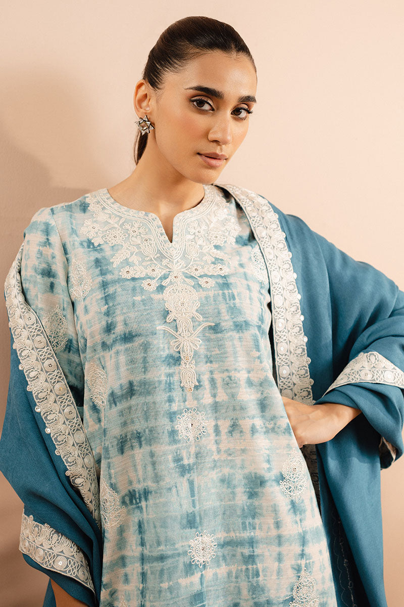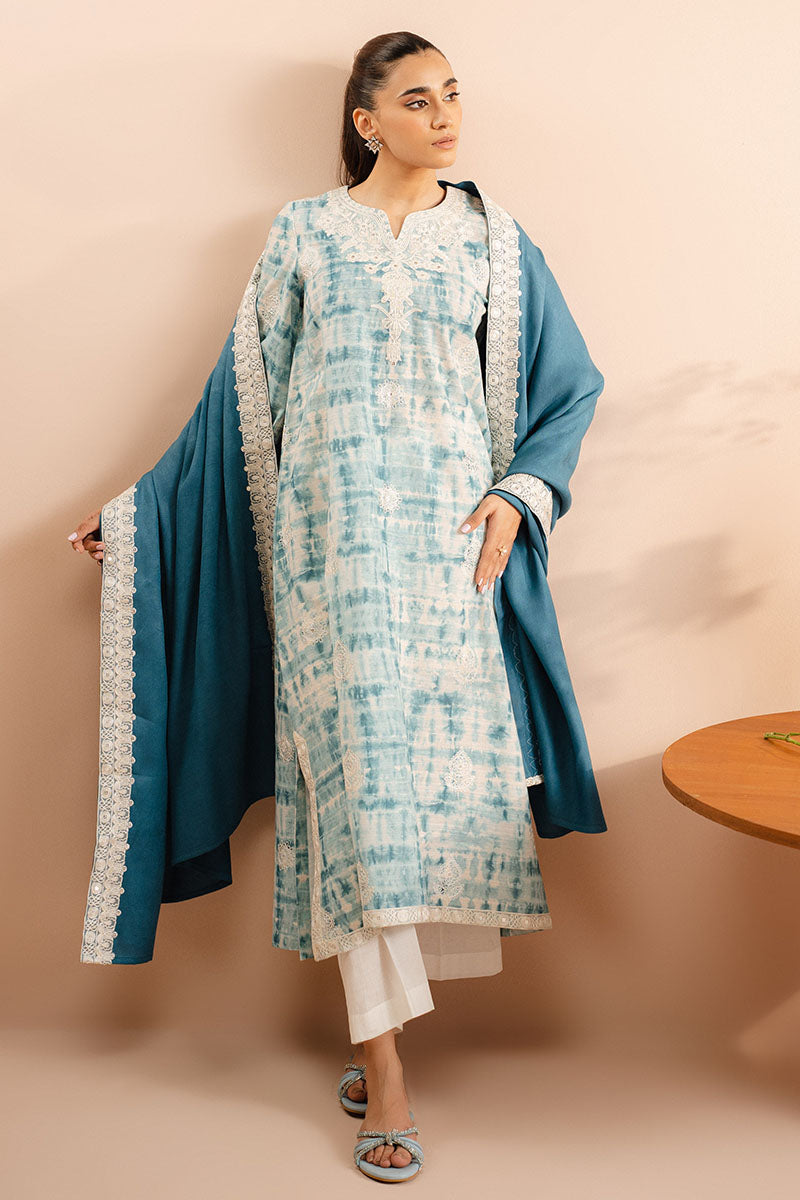 This AQUA MARINA-2 PC includes a khaddar A-line SHIRT with a printed and embroidered front, printed back, and an embroidered crew neck. The flared sleeves are also embroidered, and the DUPATTA is a staple woolen embroidered one.
