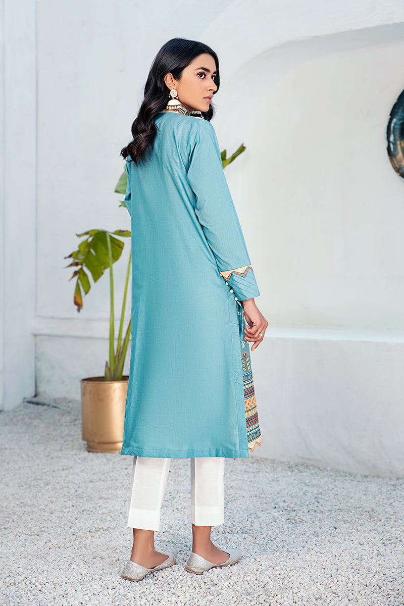The Light Blue Base with Yellow and Orange Floral Embroidery Counterparts the Vibrance to a Softer and Appeasing Contrast on this Prime Lawn Kurta. Straight fit bottom go Well with this Embroidered Kurta