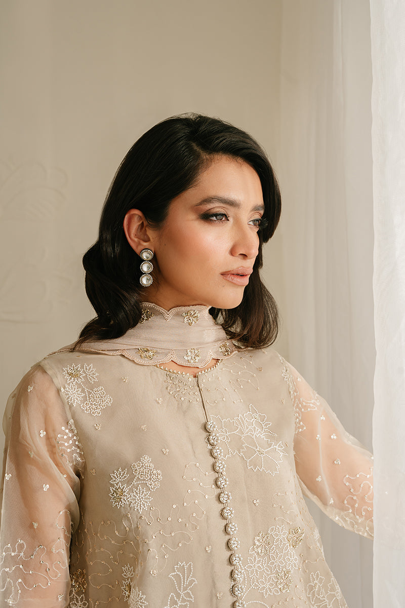 This ASH GRAY-4PC ORGANZA EMBROIDERED SUIT features an intricate organza embroidered shirt front, back, and sleeves, 80" embroidered patti for the front and back hem, 40" embroidered patti for the sleeves, a dyed silk slip, a silk dyed trouser, and a chiffon embroidered dupatta. This set exudes elegance with its intricate craftsmanship and luxurious fabrics, perfect for any special occasion.