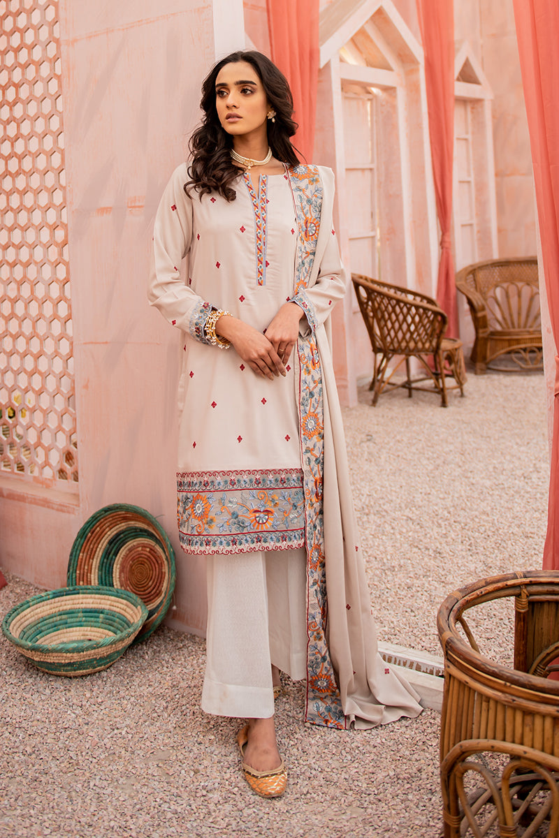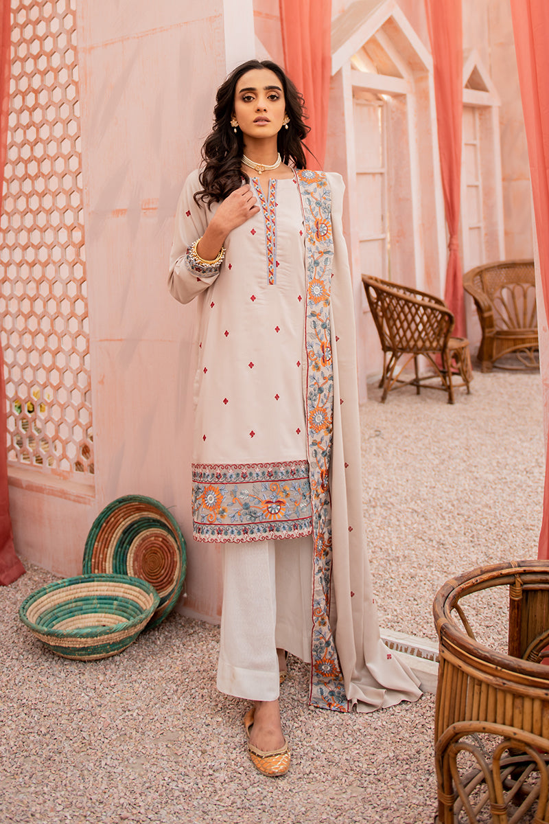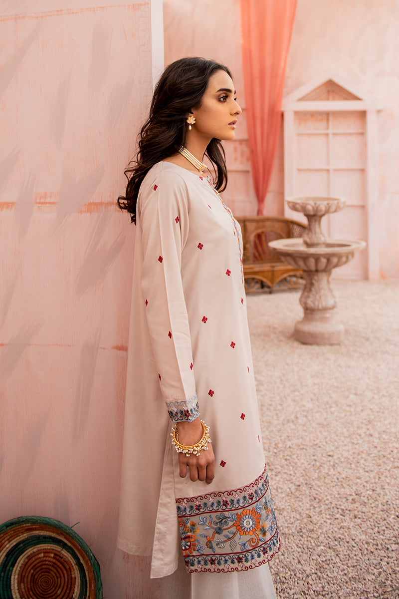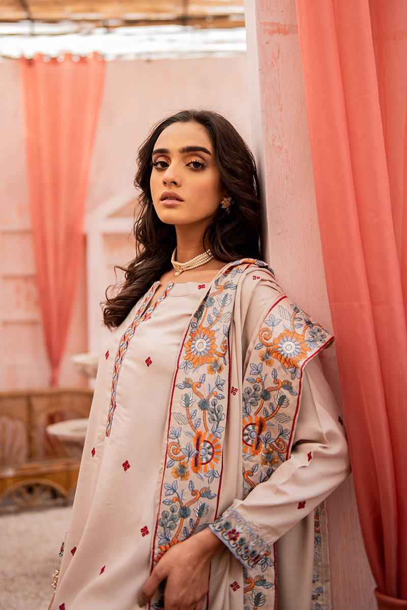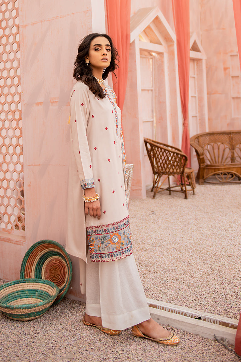 Ashen Musk is a Delicate A-Line Linen Shirt Featuring Intricate Embroidery and Tassel Details on the Neckline Paired with a Staple Woolen Shawl with Embroidered Borders. Style the Kurta Two Piece Outfit with Loose Curls and Flared Trousers.
