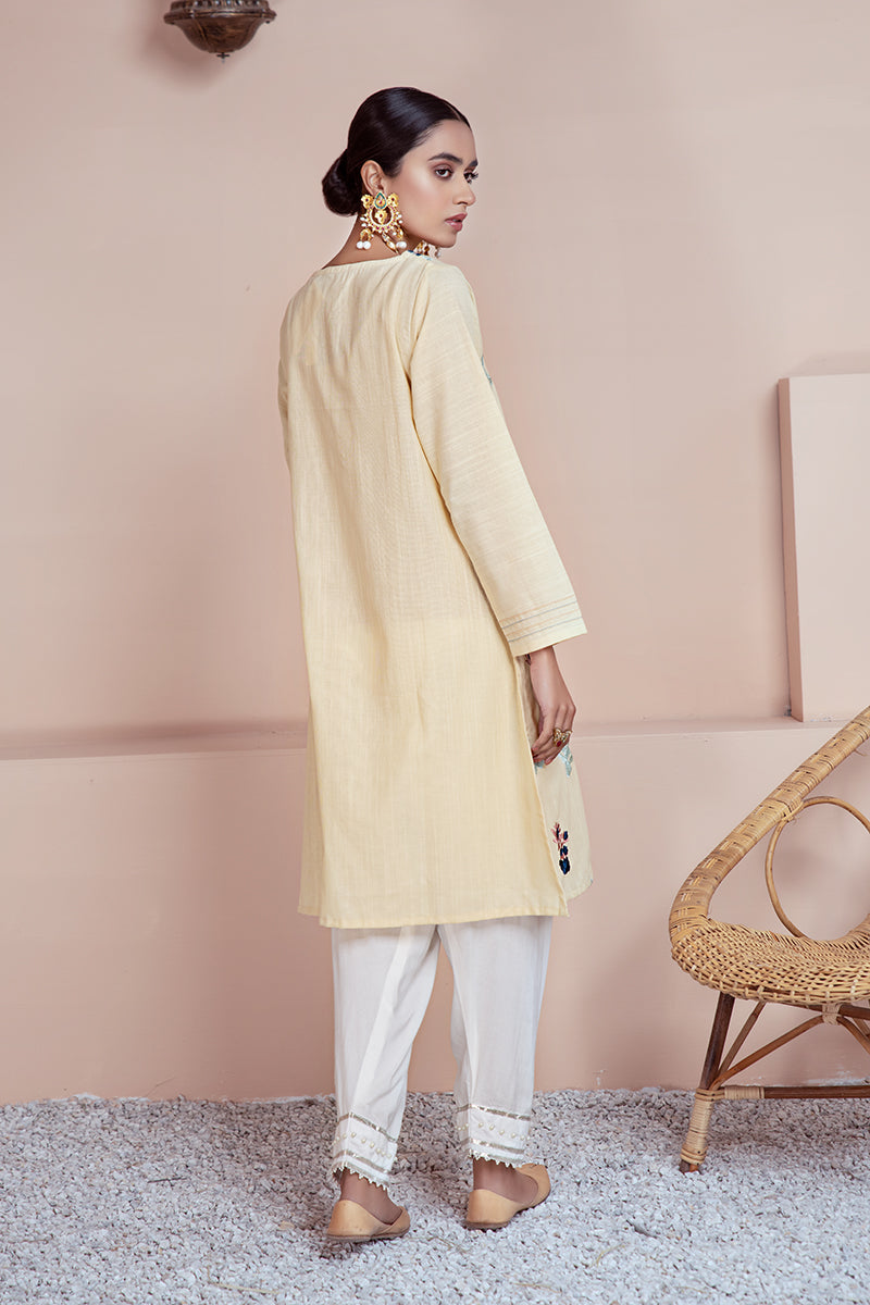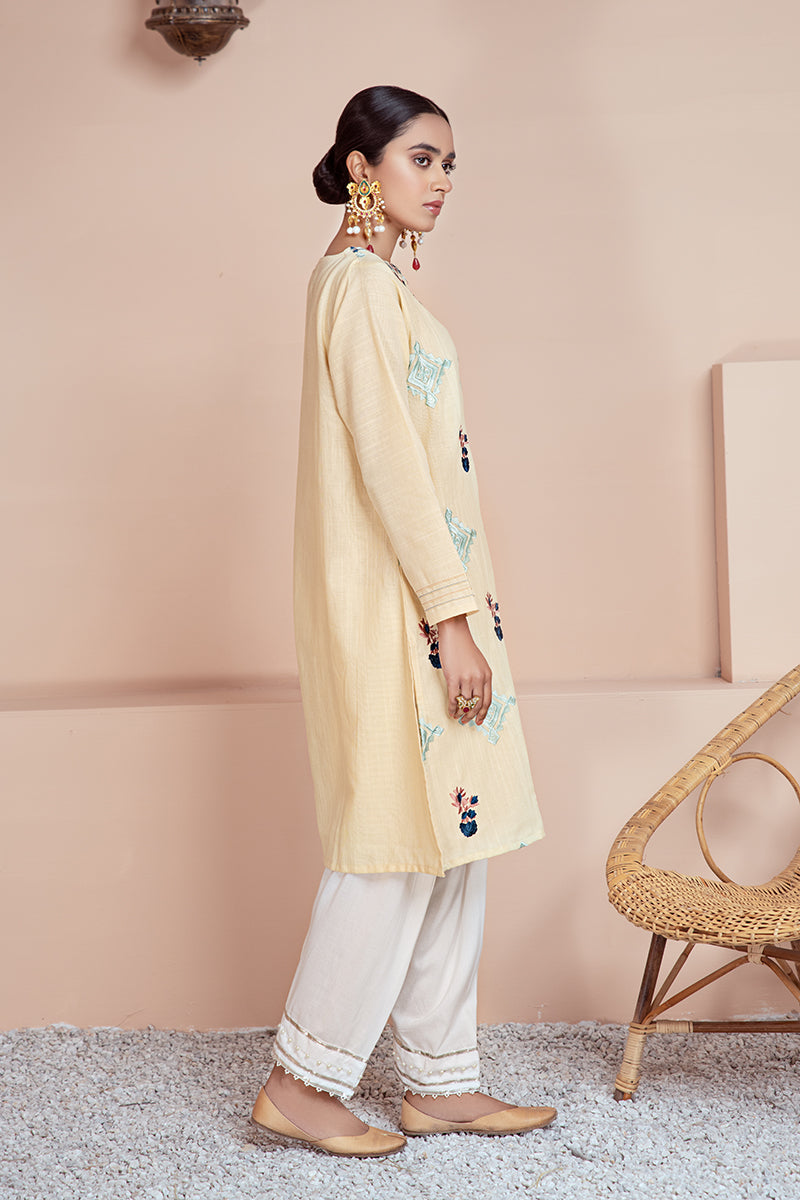 The off white blend of cotton khaddar has a subtle feel which goes on for the day. A kurta carried perfectly with shalwar for a bottom and gold jewelry.