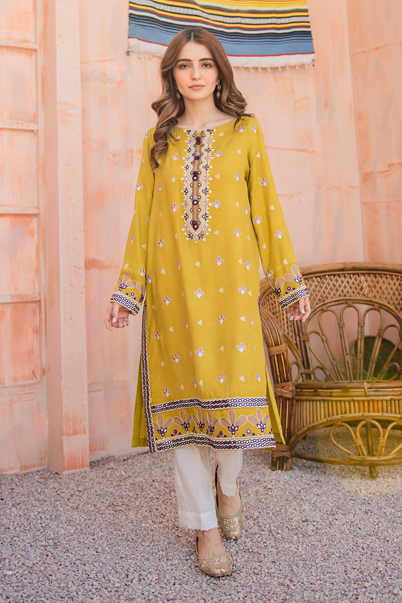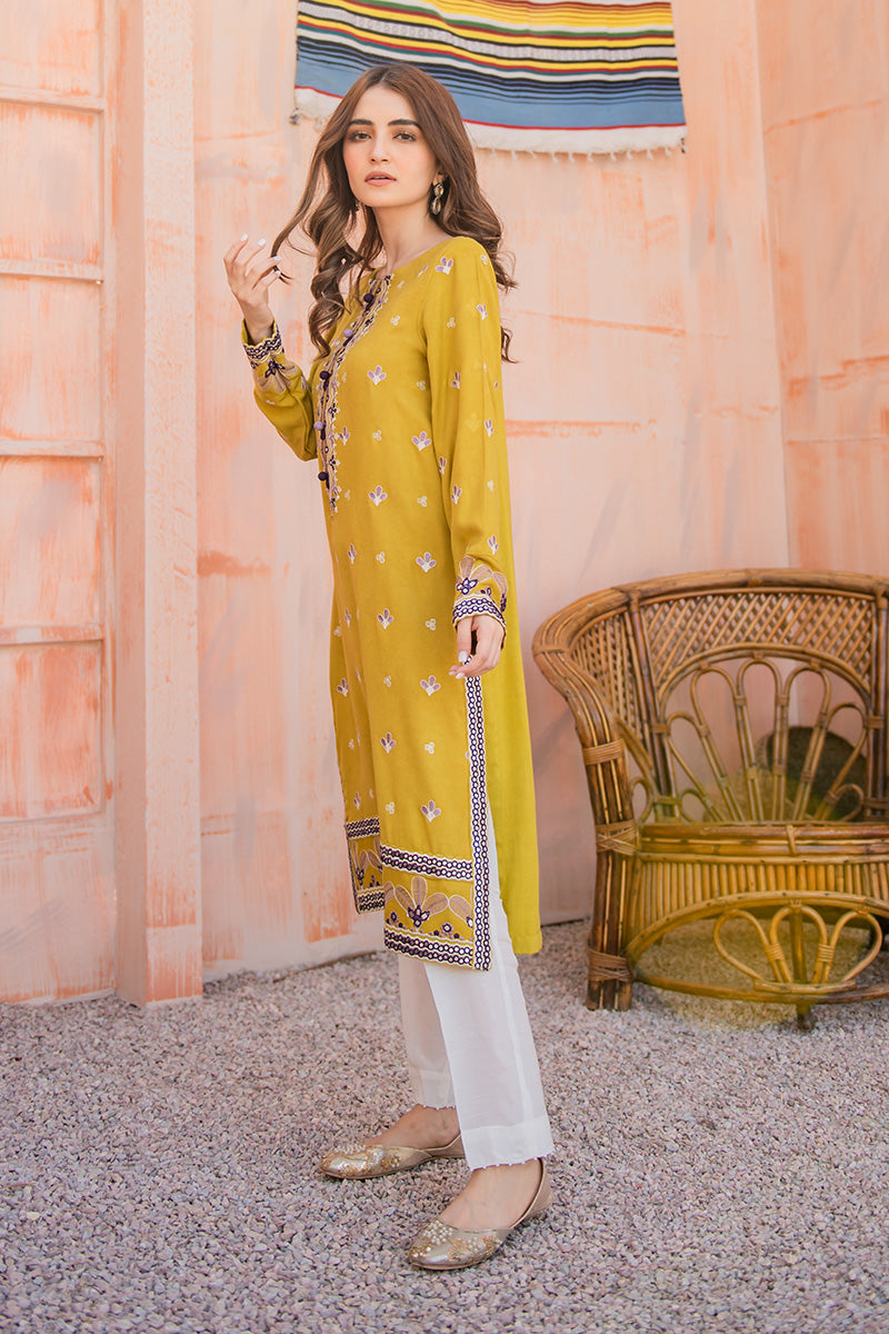 - The shirt is Rendered on an Elegant Yellow Base, Fully Embroidered with Beautiful Faux Mirror Embellishments. The Kurta can be Styled with Loose Curls, Cigarette Pants, and Embellished Footwear.