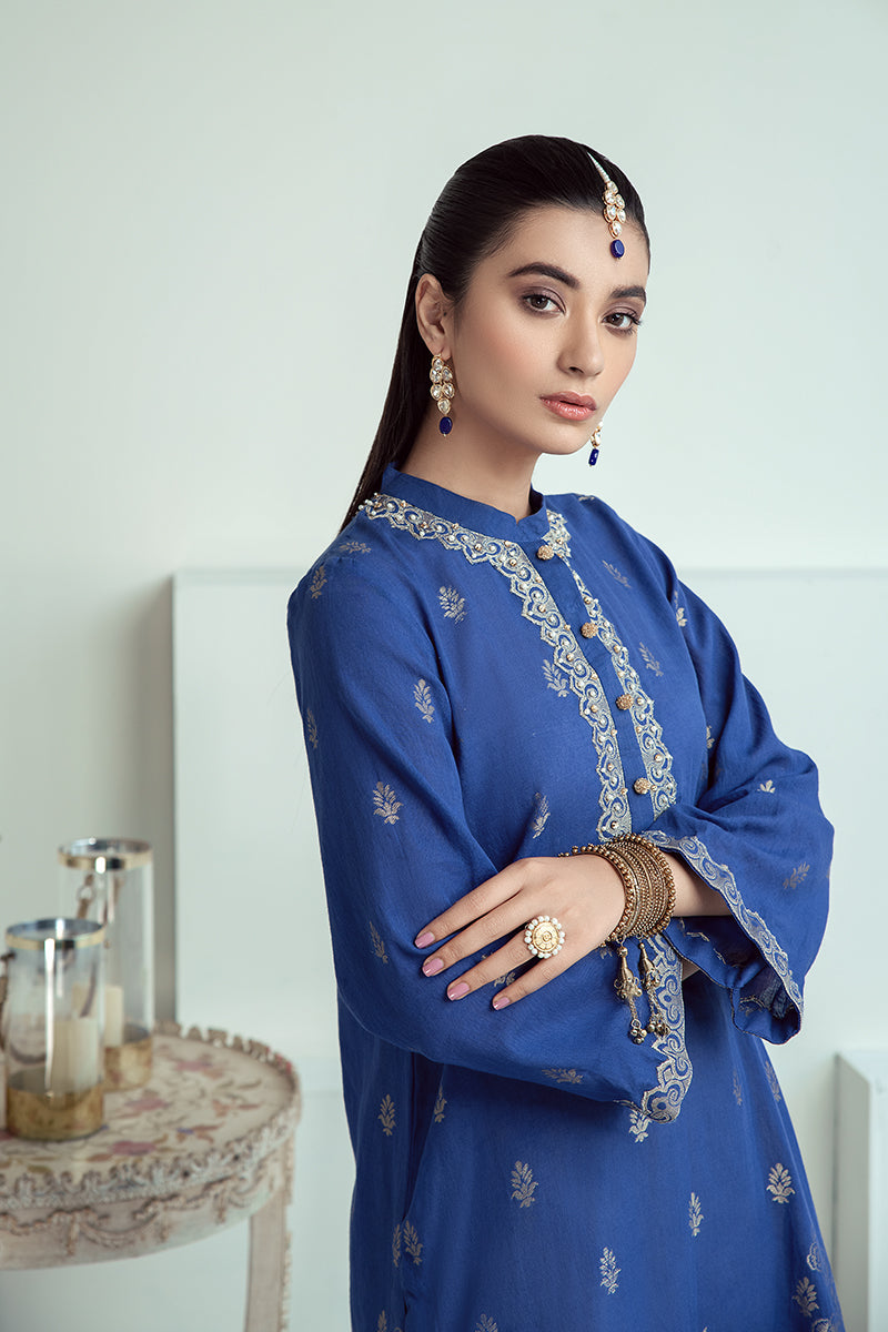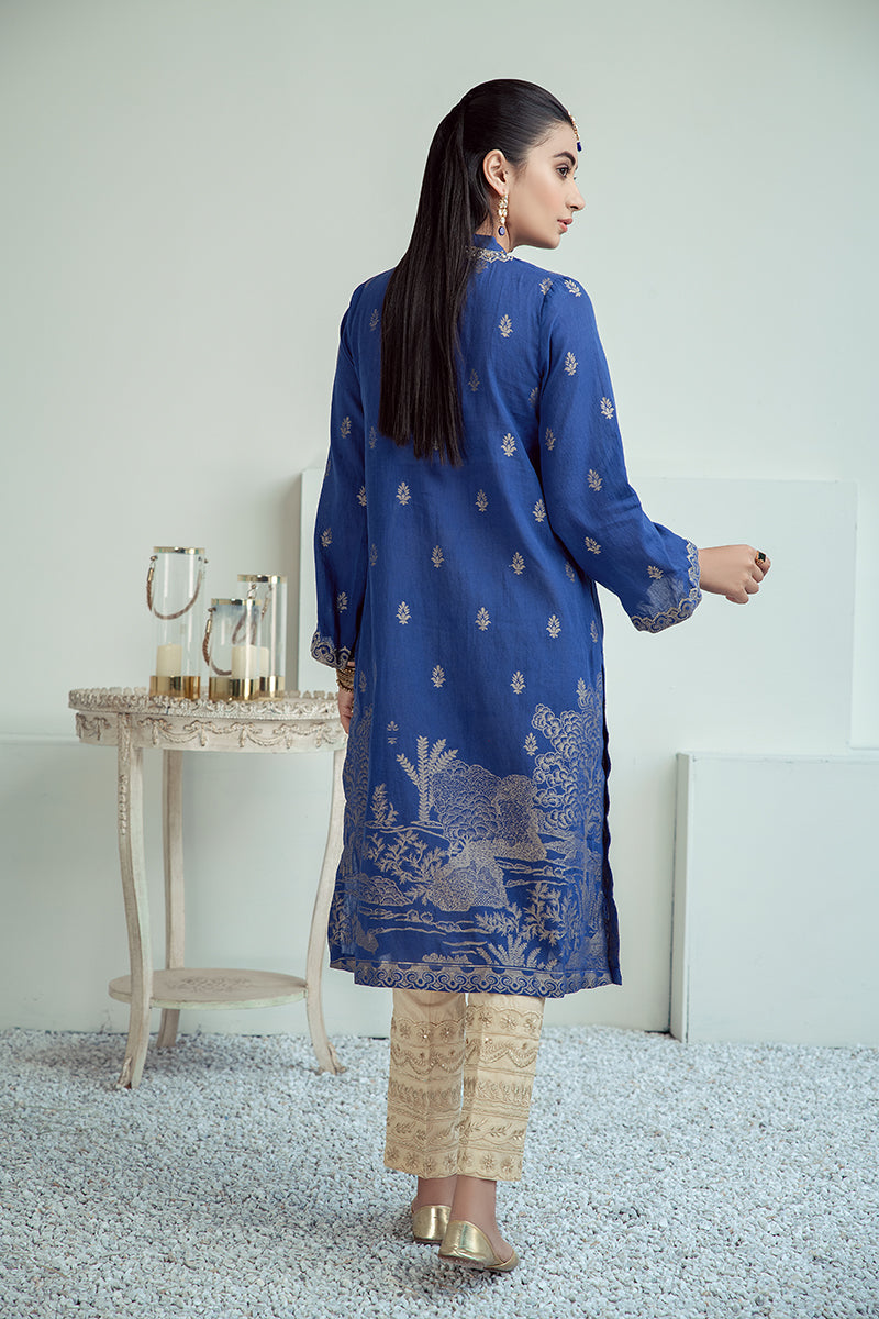 Featuring a Scenic Beauty on the Hem, Azure Perse is an Ethereal Blue Kurta with Lustrous Embellishments And Dazzling Buttons on the Front. Pair with Gold Trousers and Straight hair