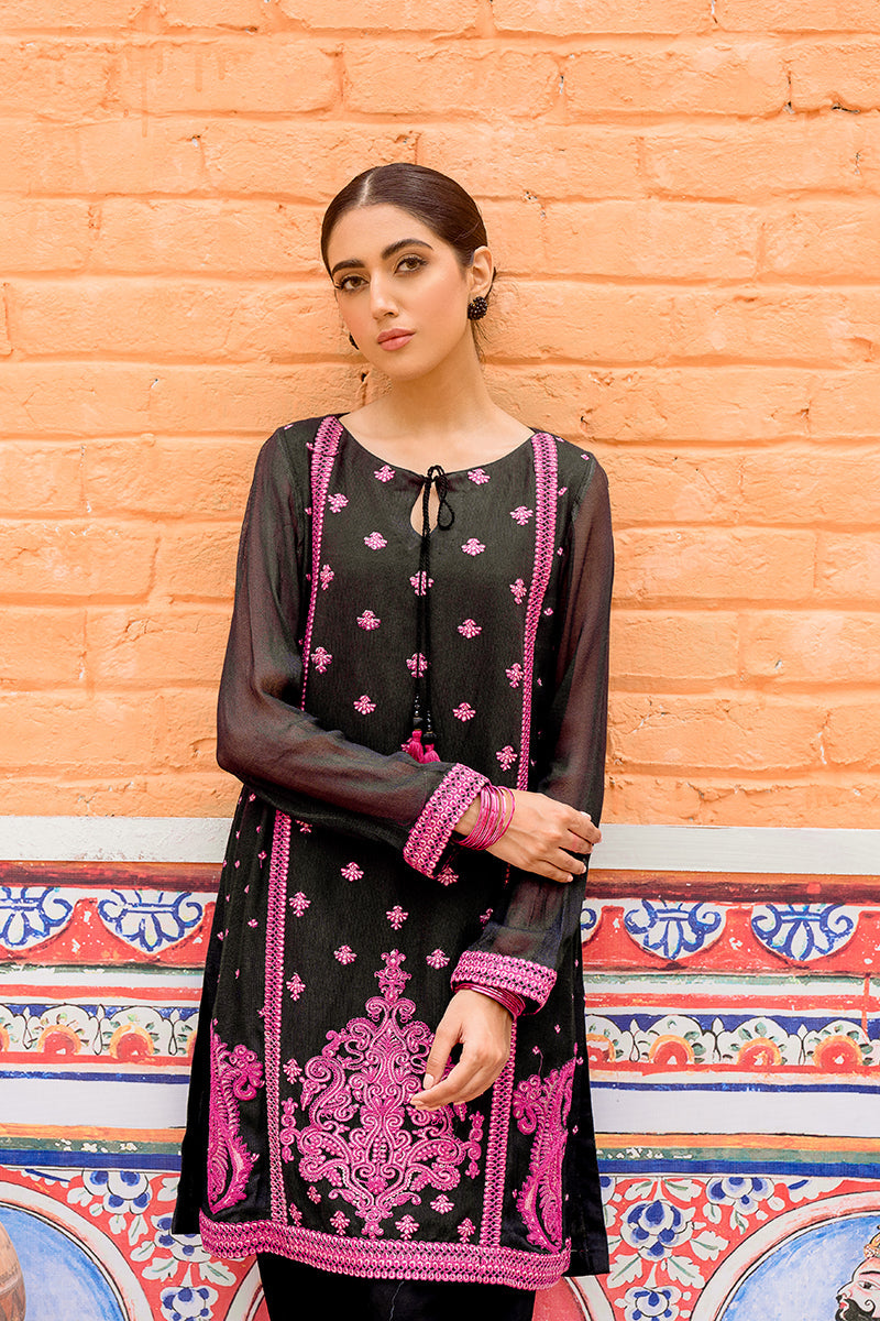 Leave an Impression Never to Forget in this Classic Black Kurta Rendered in Hot Pink Embroidery. Pair with Plain Black Shalwar