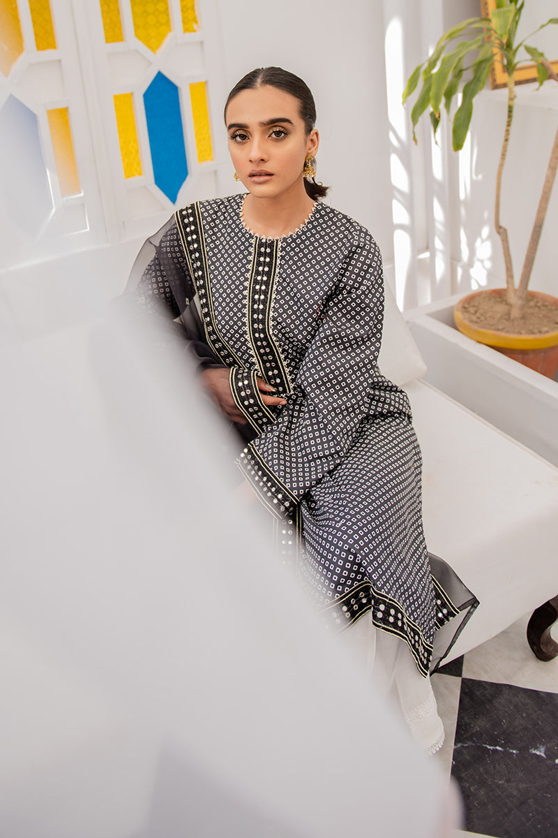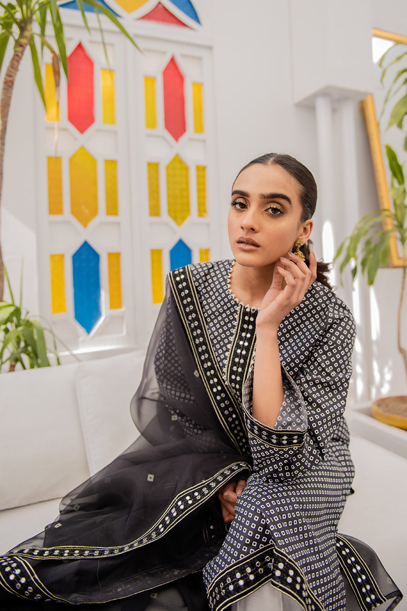 - Classic chunri printed shirt with faux mirror embroidery paired with a printed organza dupatta decorated with faux mirror embroidery borders. Pair with black khussas and straight fit bottoms.