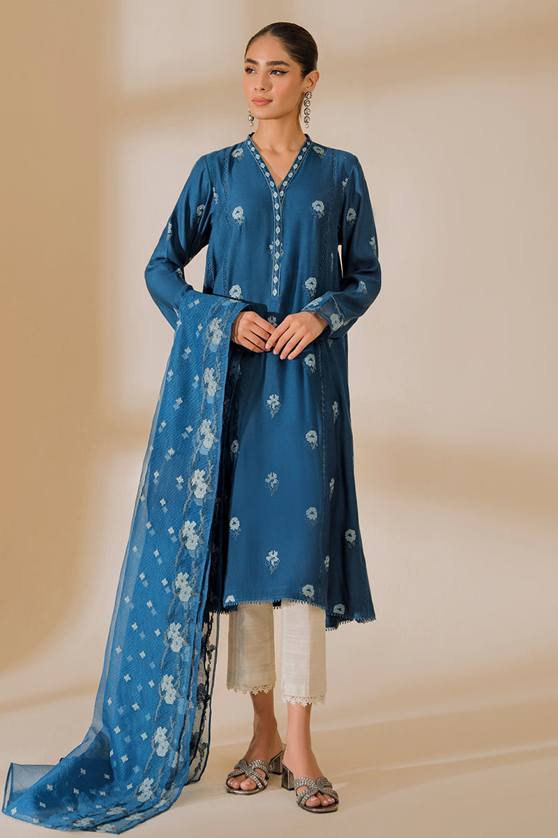 BERRY HOP-2PC (SHIRT & DUPATTA) is a fashionable ensemble, crafted from Marina fabric and featuring an embroidered wrap-around neckline and embroidered sleeves. The paneled A-line shirt is complimented by a Rajjo net embroidered dupatta. Perfect for any special occasion.