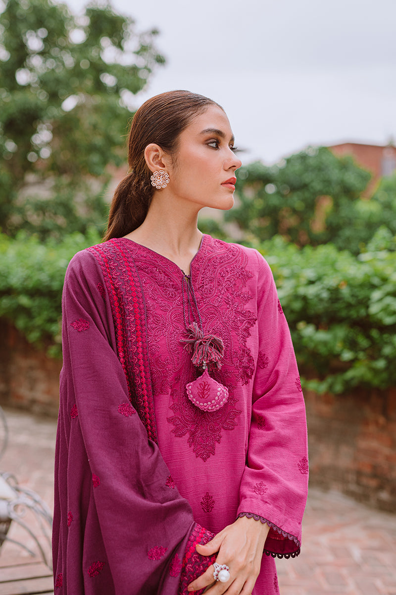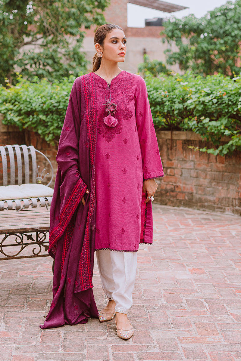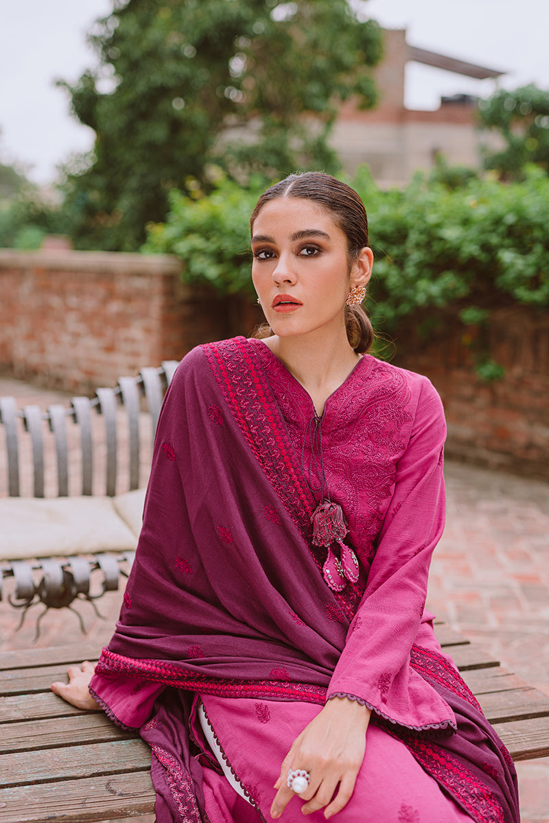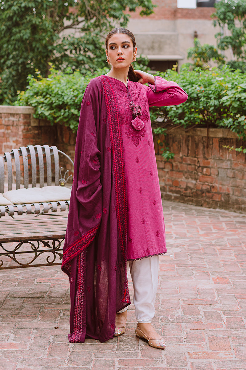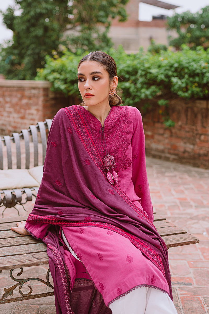 Featuring an A-line Shirt in an Elegant Mauve Pink Color, Berry Rush is a Khaddar Two Piece Outfit with an Embroidered Shawl. Go Classic with Kohl Eyes and Braided Hair to Complete the Attire