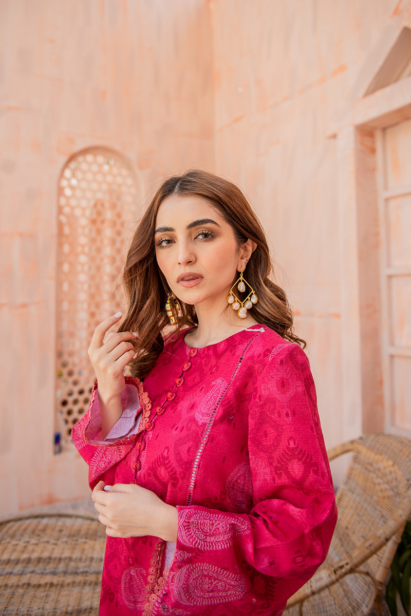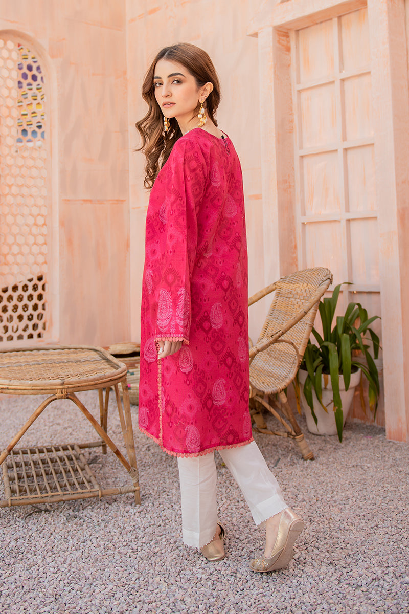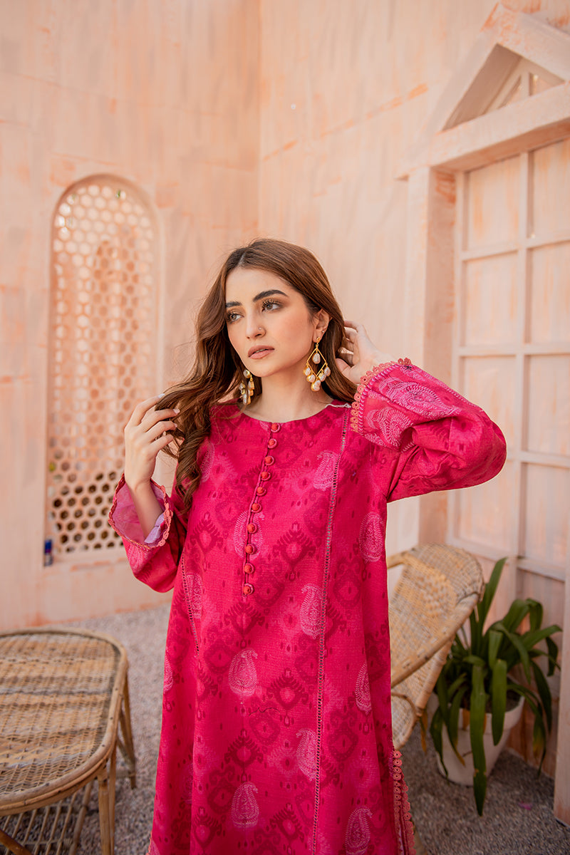 A Vibrant A-Line Panelled Khadar Shirt with Lace Details. The Printed Shirt can be Styled with Dangling Earrings and Khussas