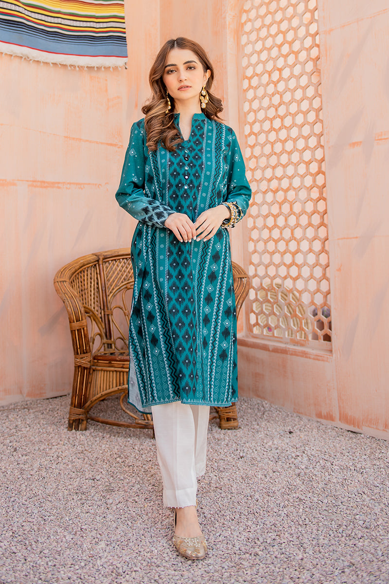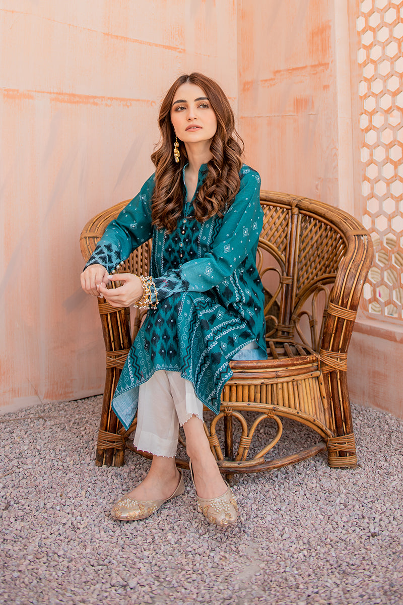 Beryl Chrome is a Breath of Fresh Air in Shades of Blue. The Digital Printed Kurta Looks Best Straight Fit Bottoms