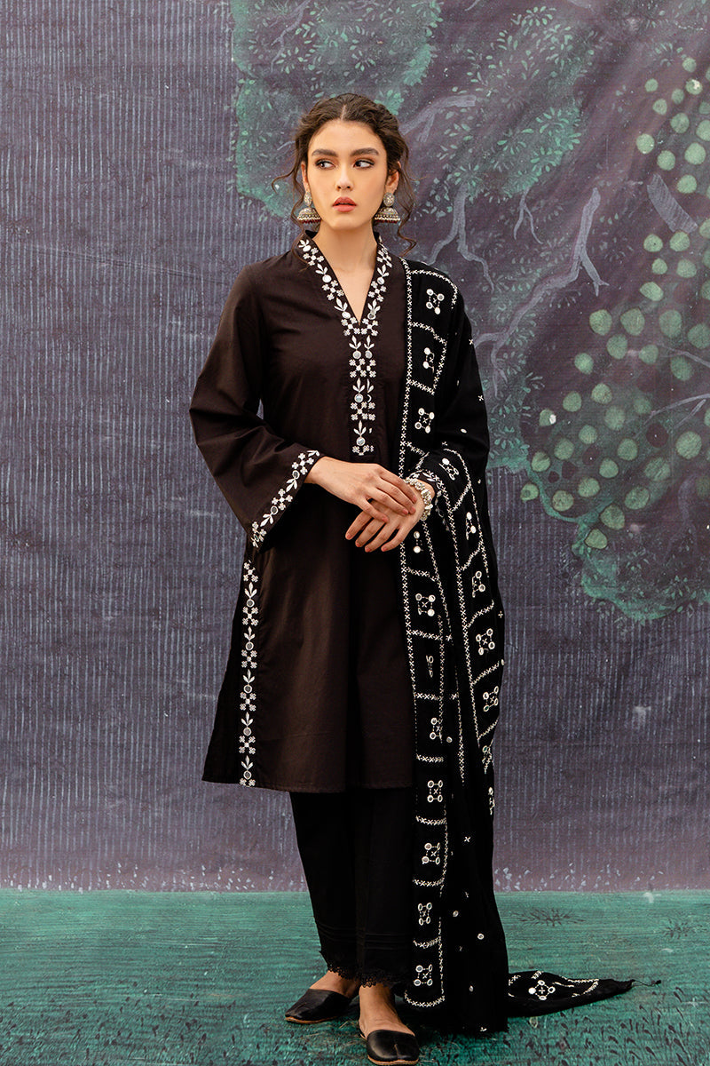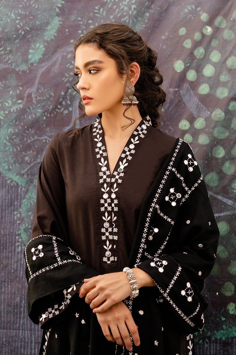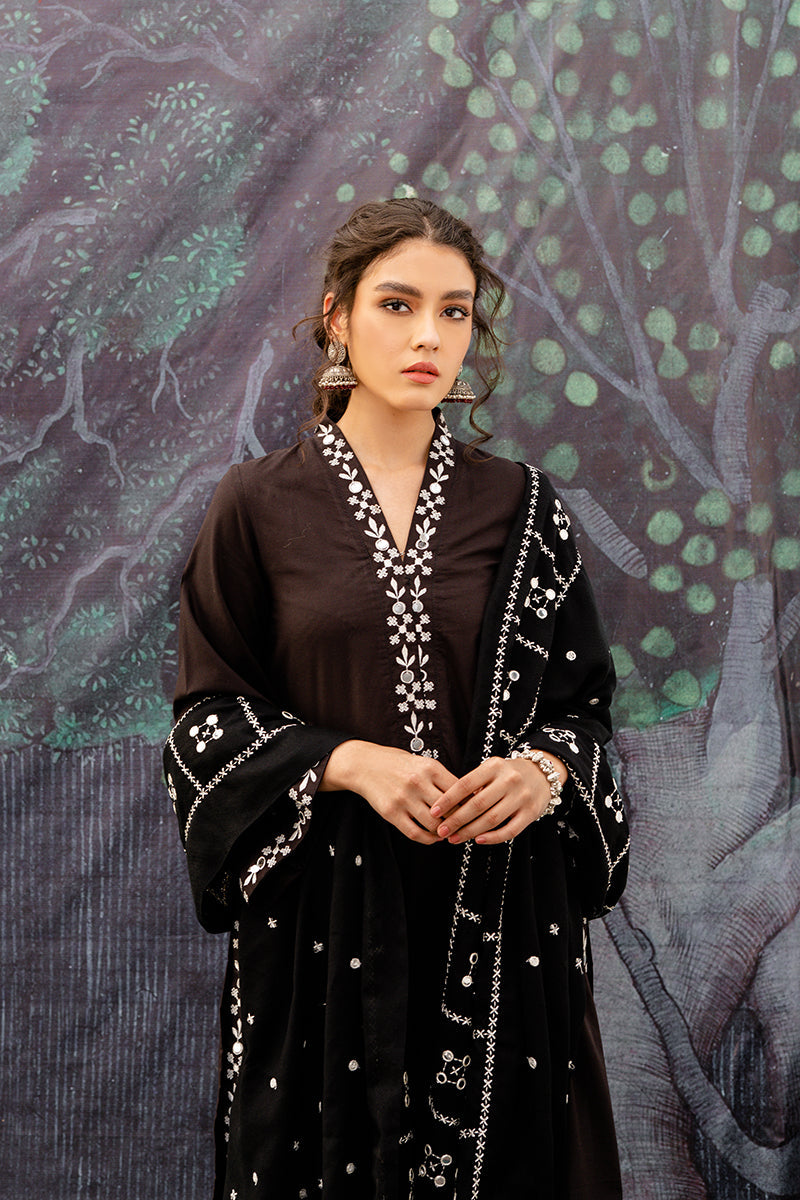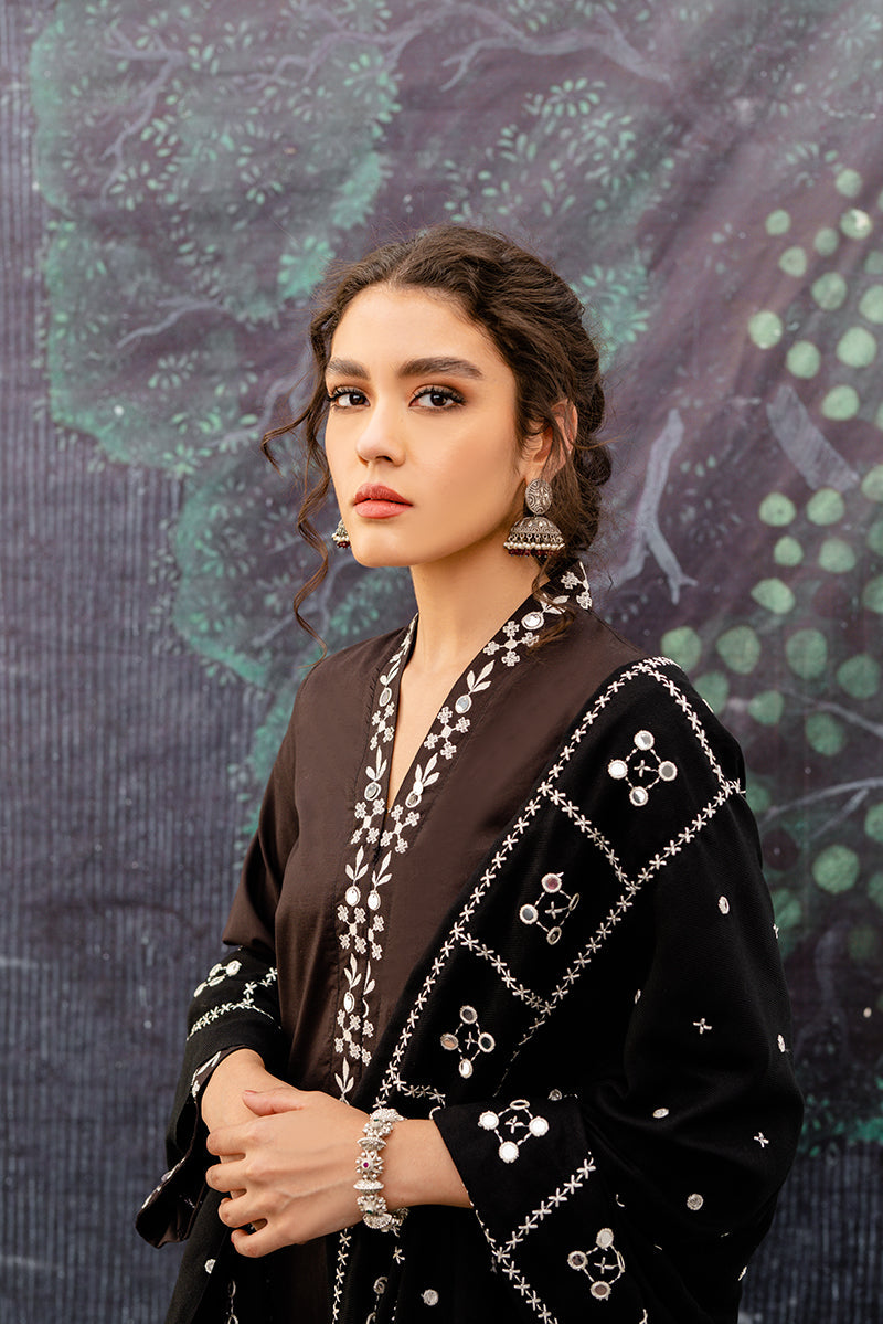 The mystic black smoke is an expression of boldness and power. This 2 piece linen dress is carried with a slim cut shalwar, a go to khussa set and precious gemstones to compliment the shawl.