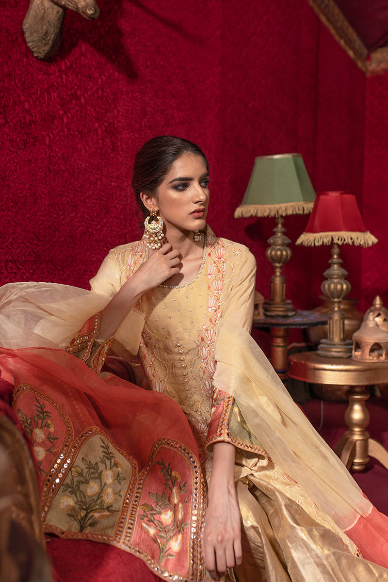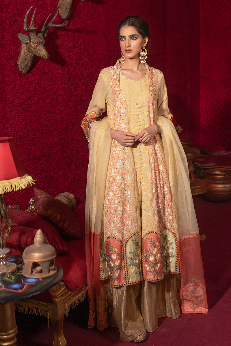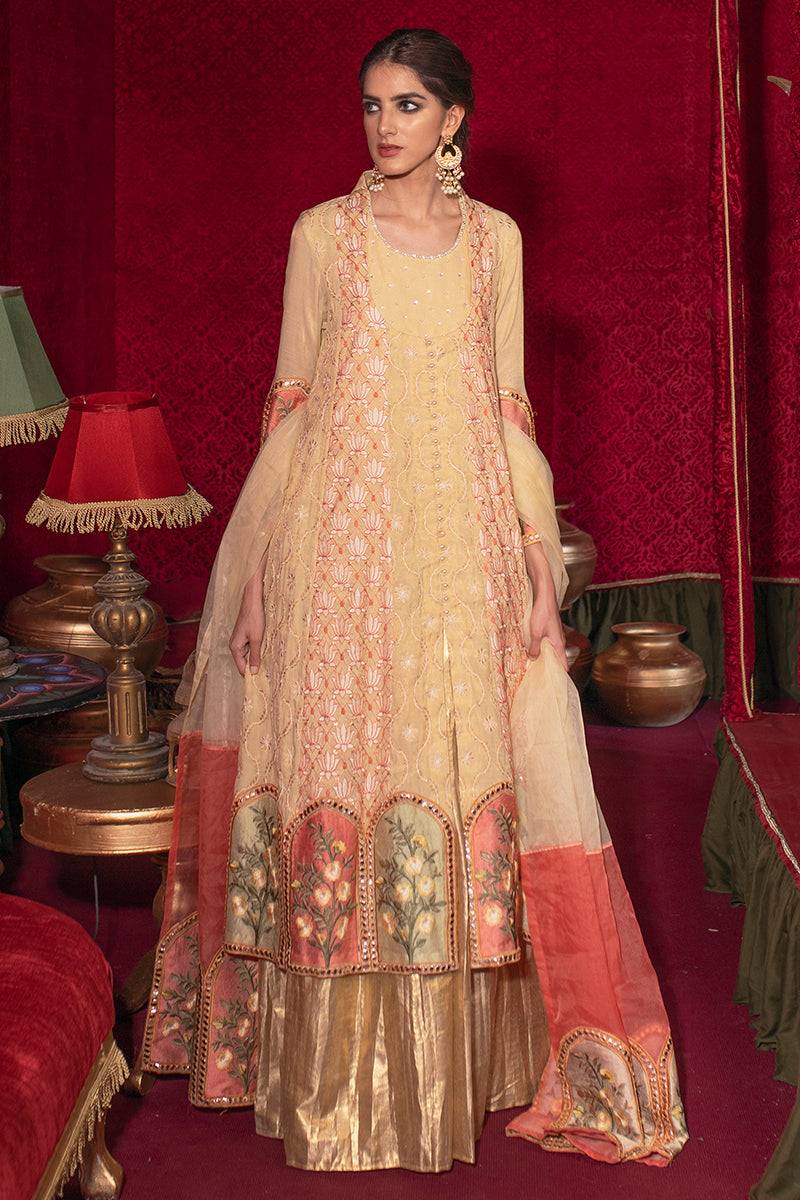 Style tip: This beautiful modern pishwas style dress is a must-have for eid parties or intimate wedding functions. Pair it either with white embroidered straight pants from our formal pants collection or style with gold sharara and finish it off with some statement earrings.
