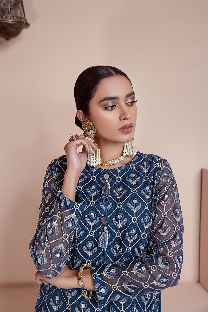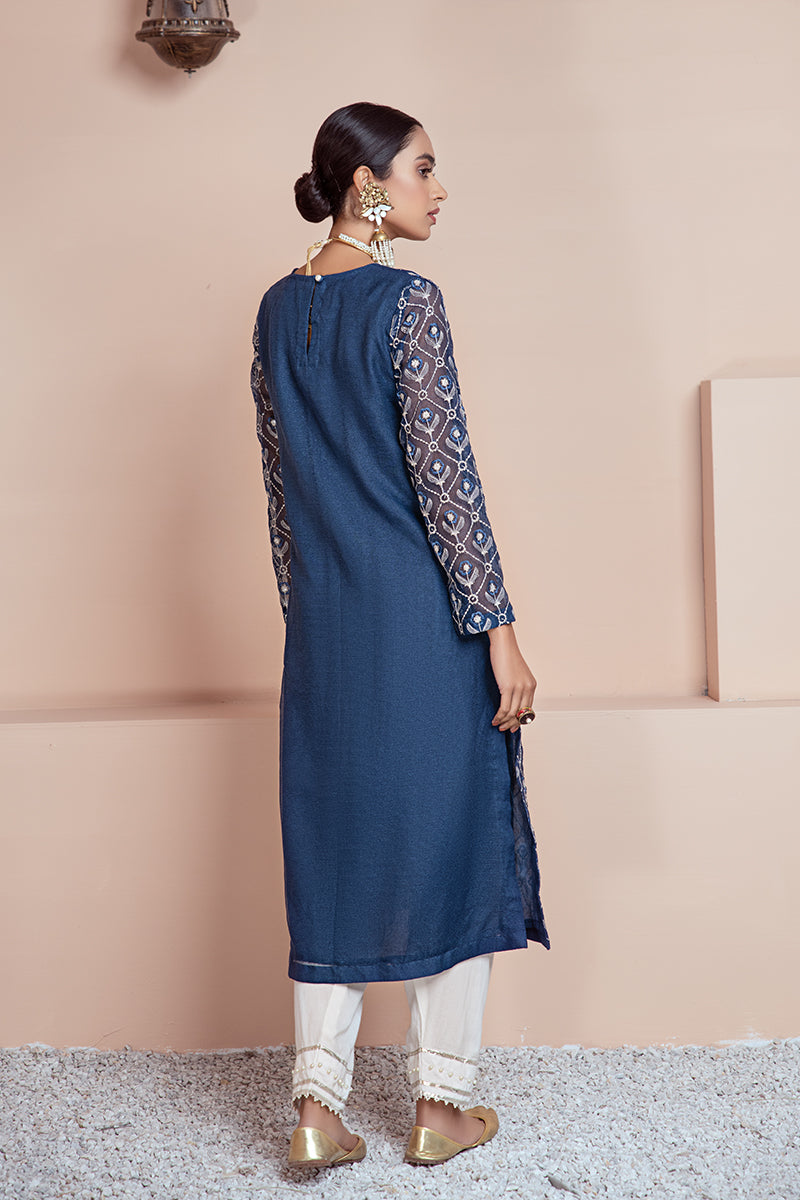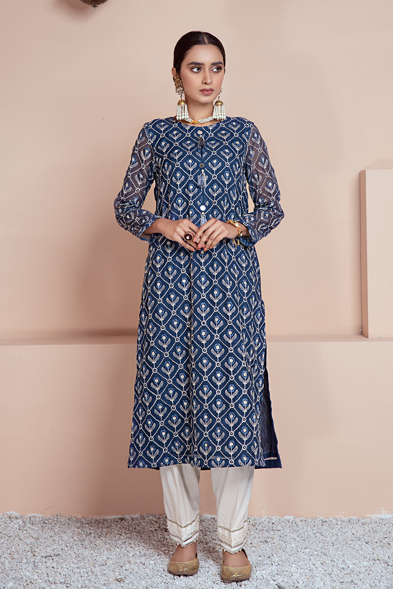 STYLE NOTE: FESTIVE RTW NET EMBELLISHED KURTA WITH SOLID BLUE COLOR AND A WHITE TOUCH ON THE FRONT.