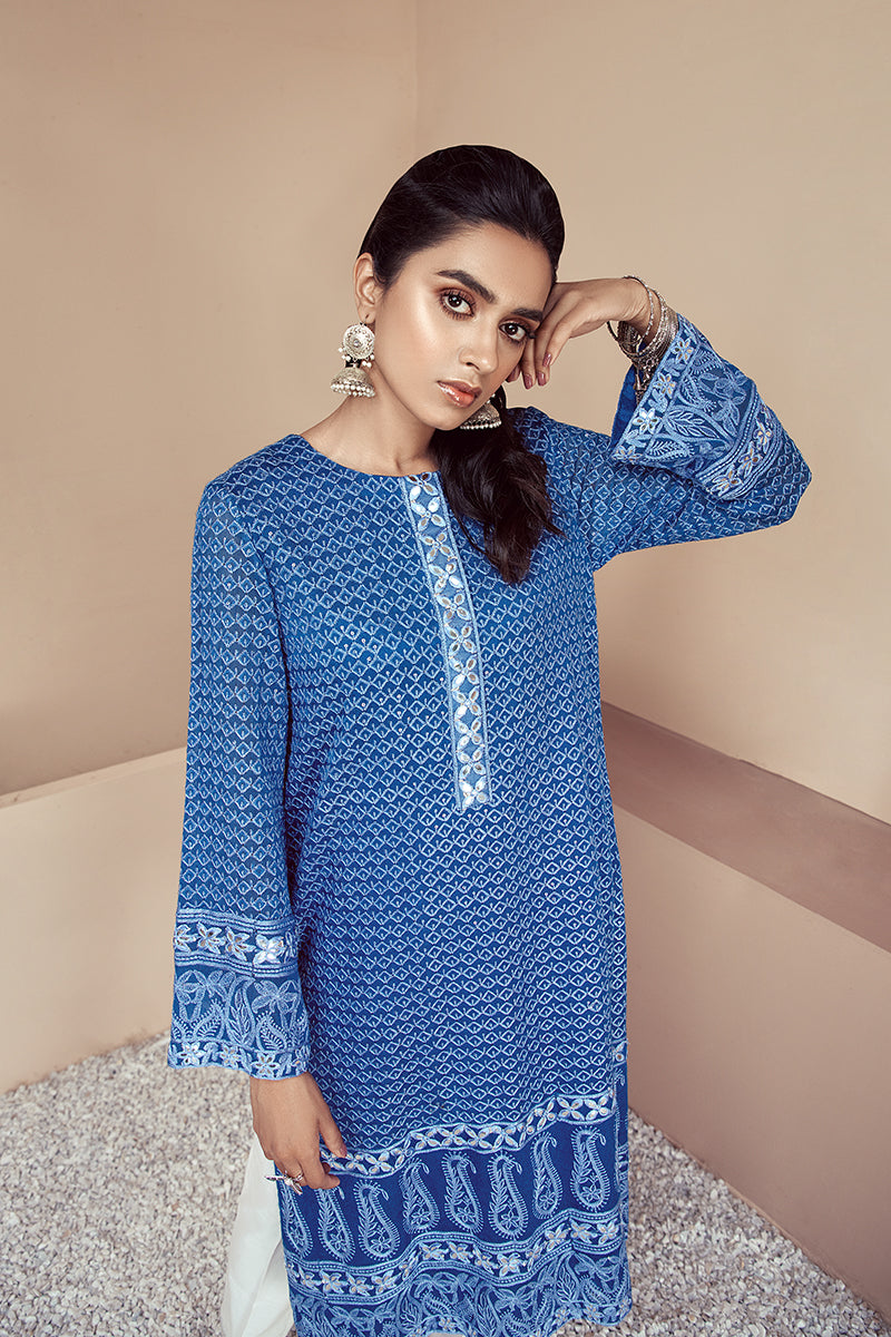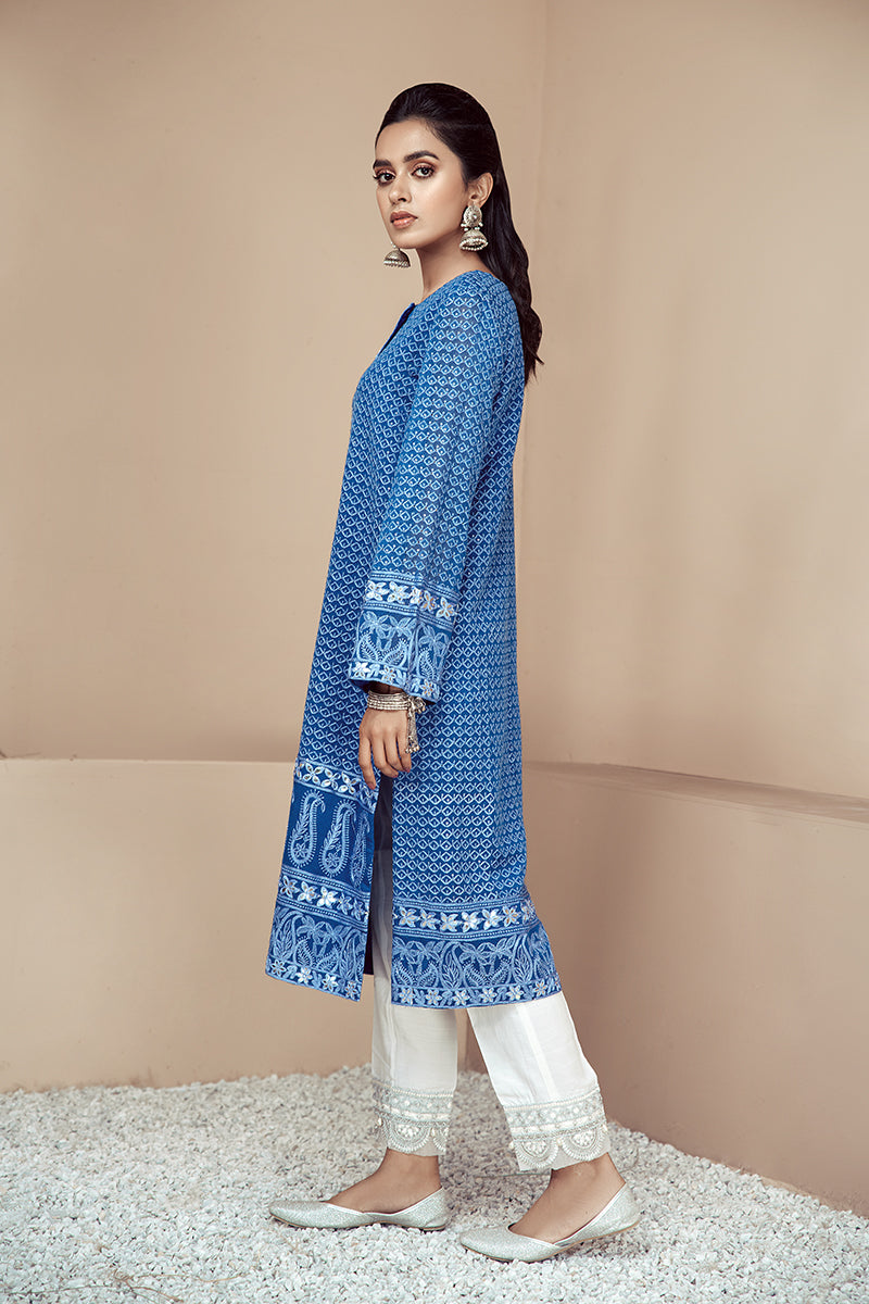 Dive into the Mystic Blue Tones with this Net Kurta Featuring Hints of Floral Embellishment and Patchwork. The Kurta Stands Out Paired with Embellished Trousers