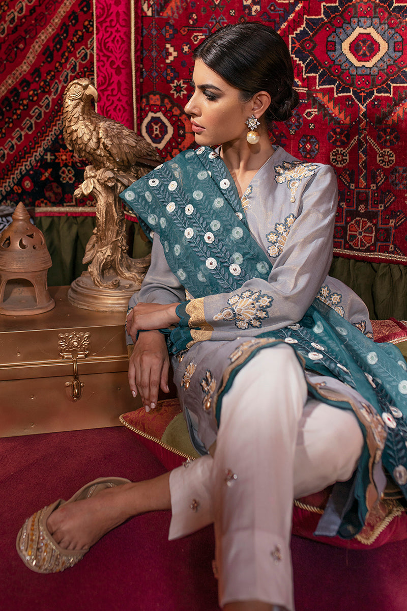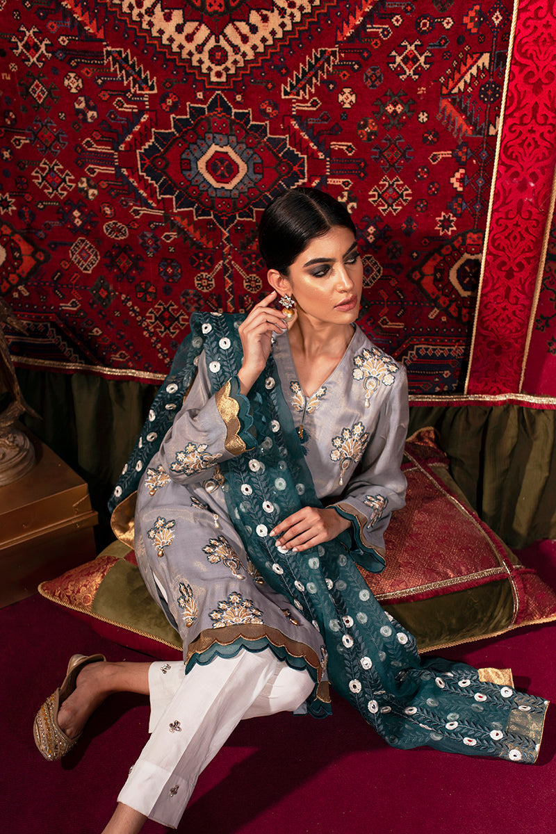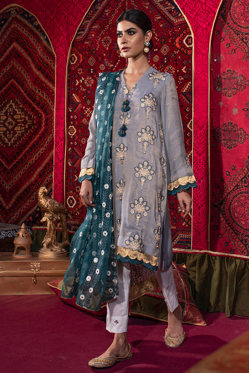 Shirt: Loose fit A-Line style shirt with sequin embroidery, pearl drops, organza scallop details on sleeves and hem along with button tassels on the front.