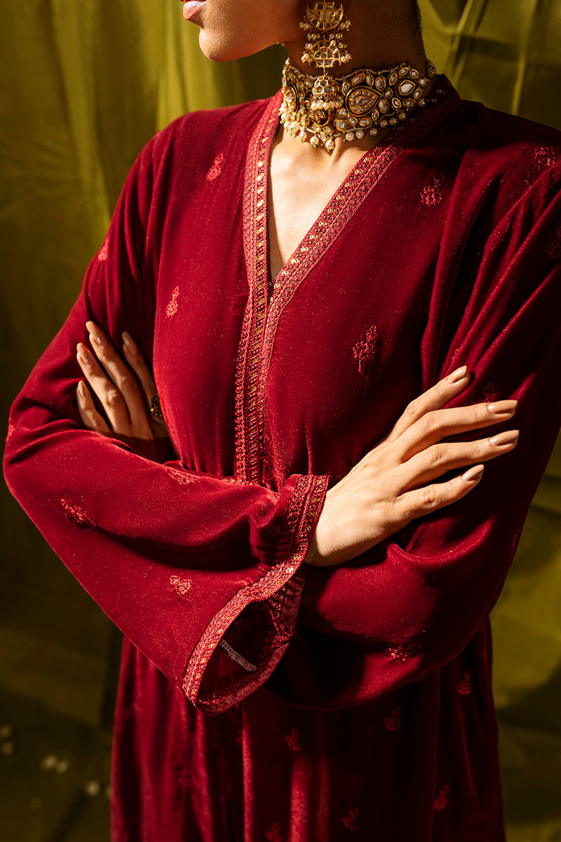 - This lush deep red velvet suit will make you look straight out of a dream. Style it with golden pants and Cross Stitch's red and gold khussas
