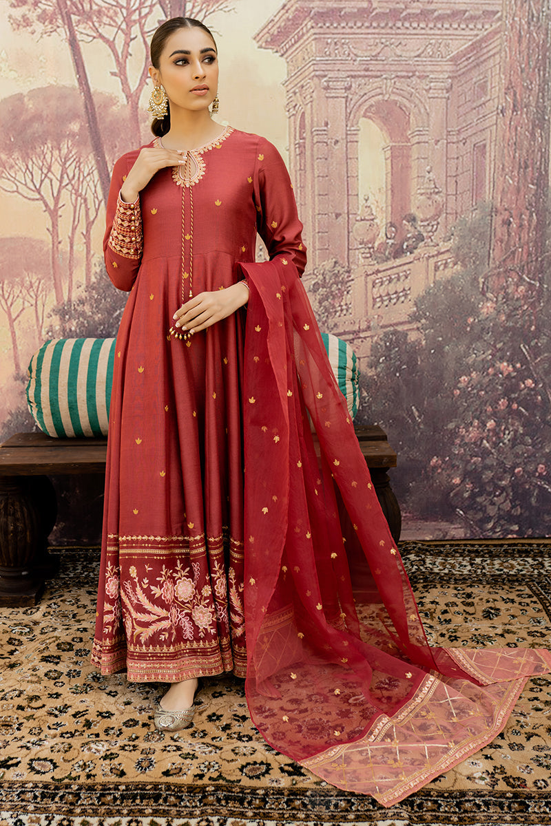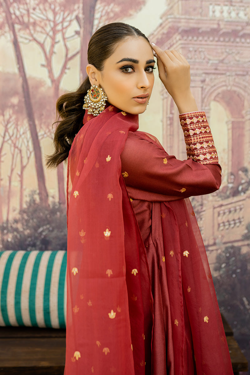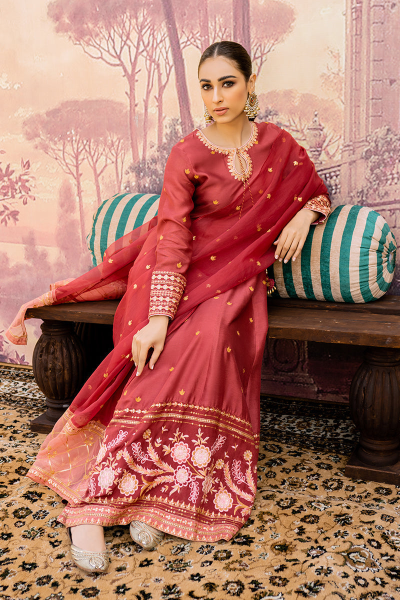STYLE PISWAS, KHADDI NET, FRONT EMBROIDERED, BACK EMBROIDERED, NECKLINE SMALL ROUND WITH KEY HOLE FINISHED OFF WITH HAND EMBELLISHED TASSELS, SLEEVES EMBROIDERED