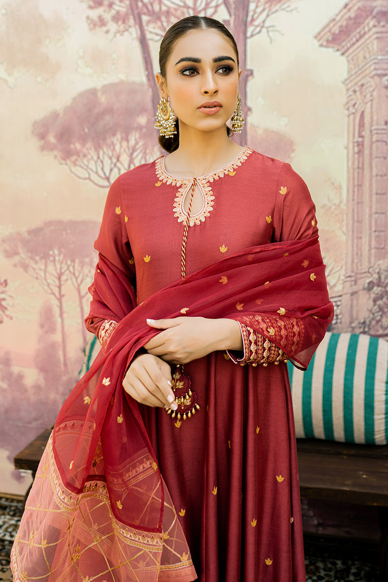 Grace yourself in this subdued khaddi net embroidered pishwas with delicate details. The embroidered attire features a key hole neckline finished off using hand embellished tassels and comes with sequin embroidered contrast border organza dupatta. Style with a smokey eye look and an an elegant bun or ponytail.