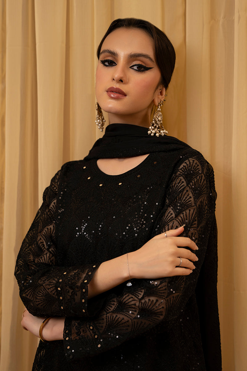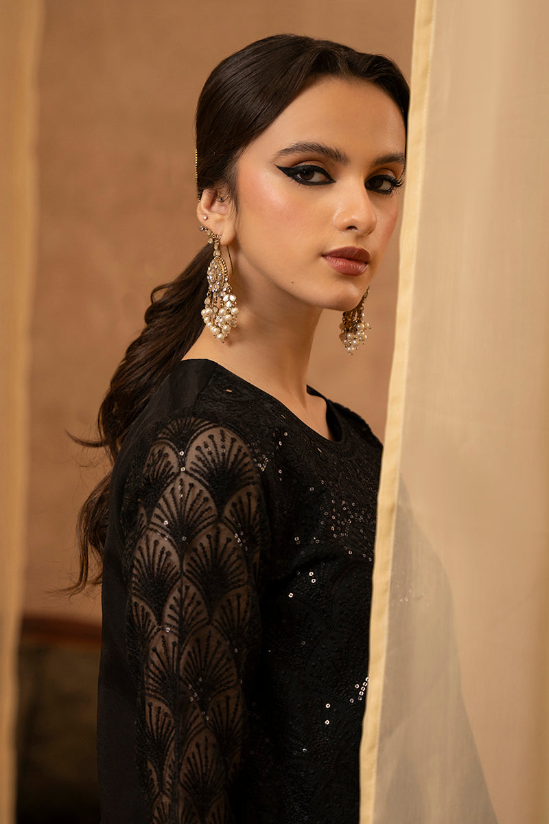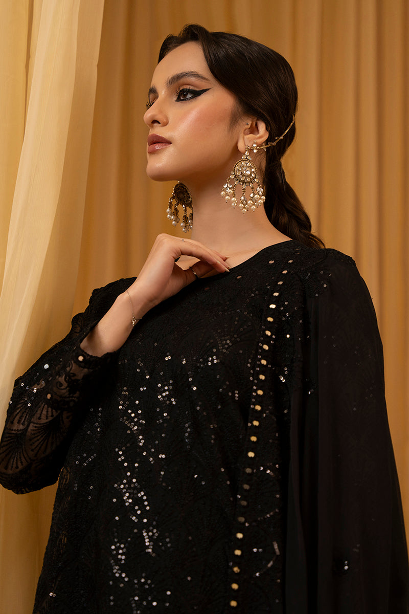 - Discover elegance with this 2-piece organza suit. The straight shirt boasts front embroidery, while the back offers a plain dyed finish. The round embroidered neckline and chiffon dupatta add a touch of sophistication. Perfect for any occasion, this suit radiates celestial shine.