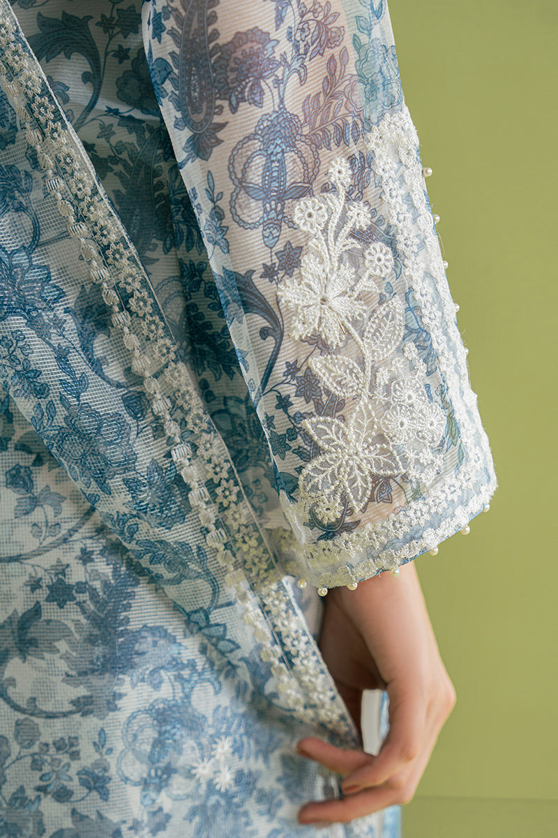 - Elevate your style with our CERAMIC BLUE-2 PC, which includes a printed, net straight shirt with lace hem and a beautifully embroidered dupatta. The tasseled details on the neckline and sleeves add an elegant touch. Made with rajjo net fabric, this set is perfect for any occasion.