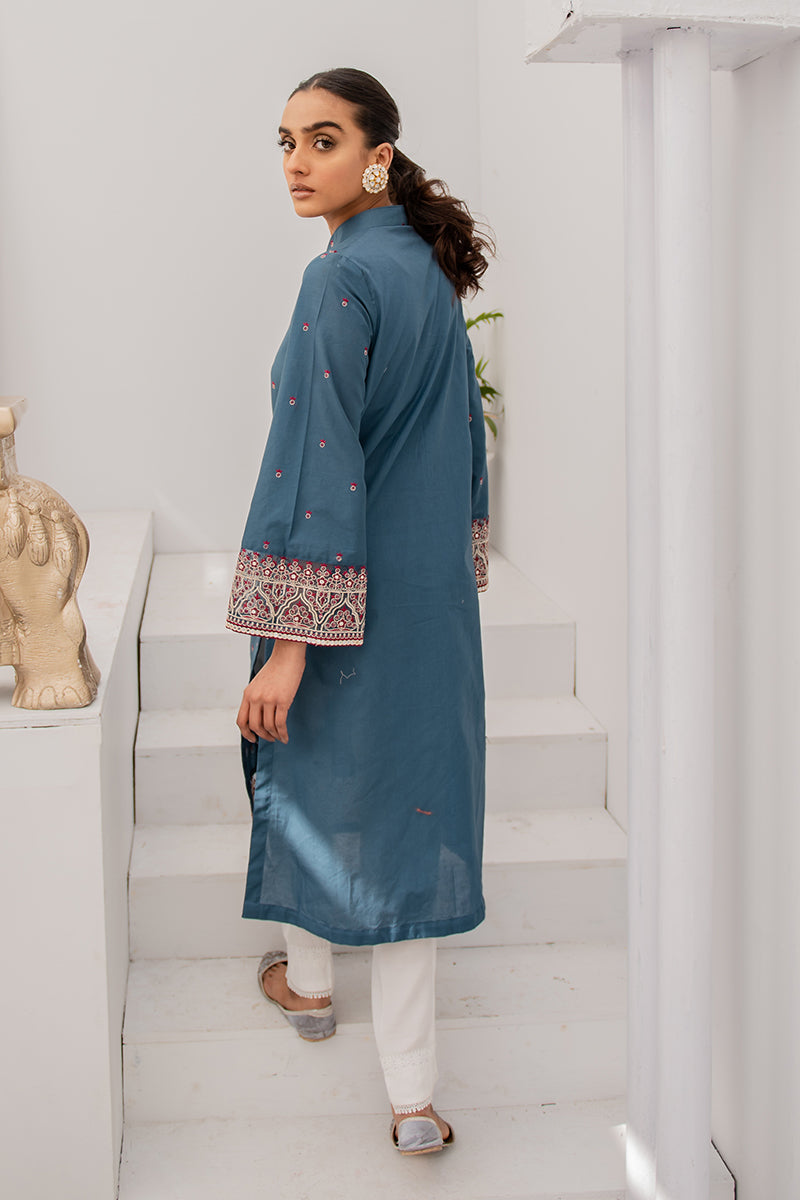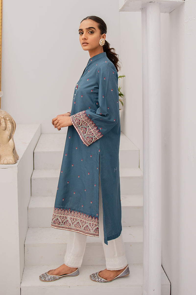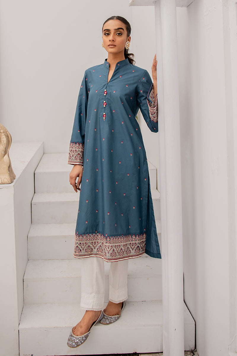 - This ashy cerulean blue kurta embellished with the most gorgeous details is all you need this summer! Pairing the kurta with a crisp white straight trouser, don yourself in style with cross stitch's collection of exclusive pret.