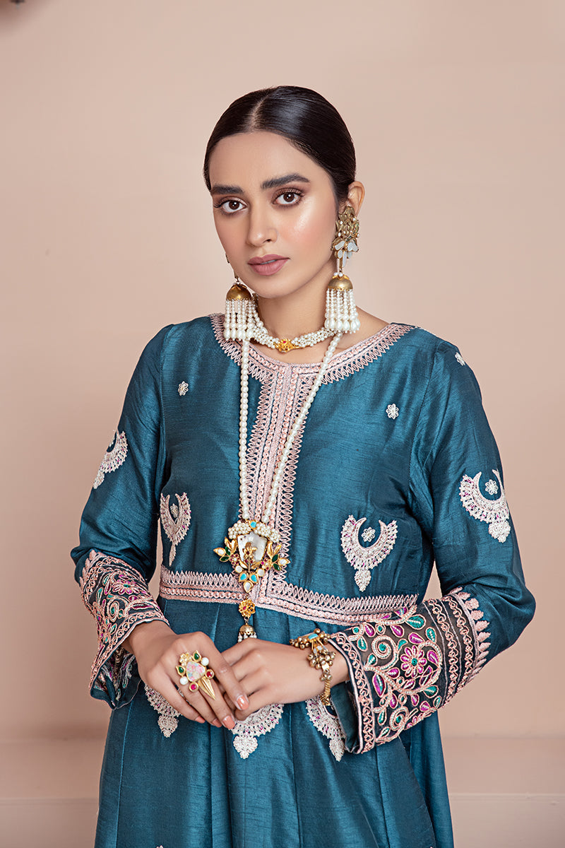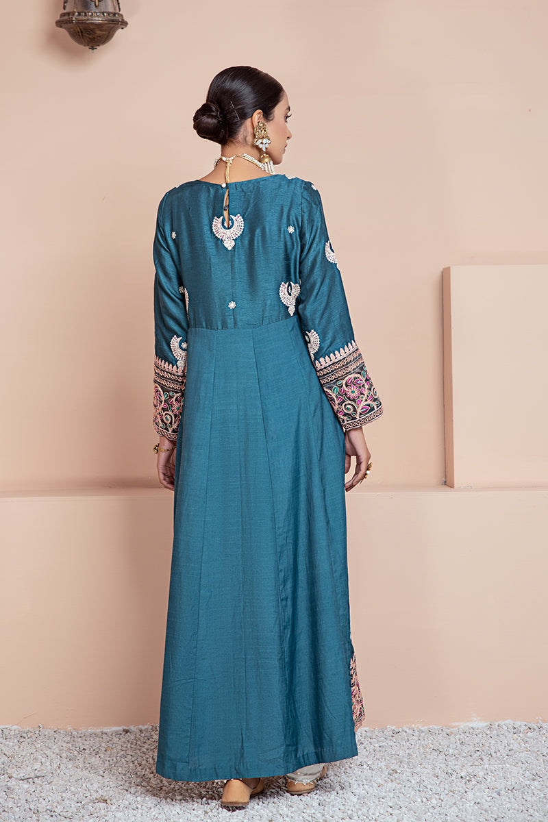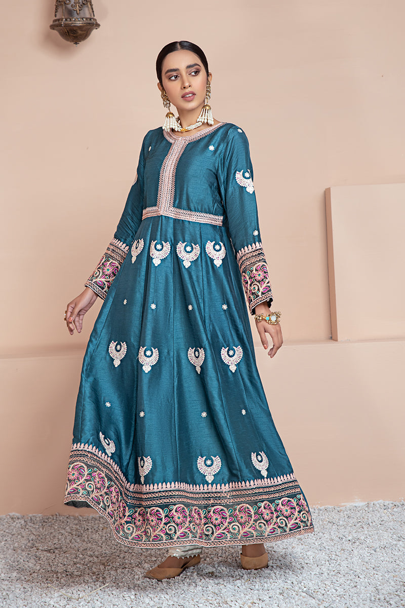 Look Like Royalty in this Olympic Blue Frock Graced with the Traditional Chaan Baali Motif on the Front Panel. The touch of Fucshia and Teal added to the Zari Embroidery makes this Divine Attire a Festive Essential. Pair with a Churidar Trouser or Cigarette Pants