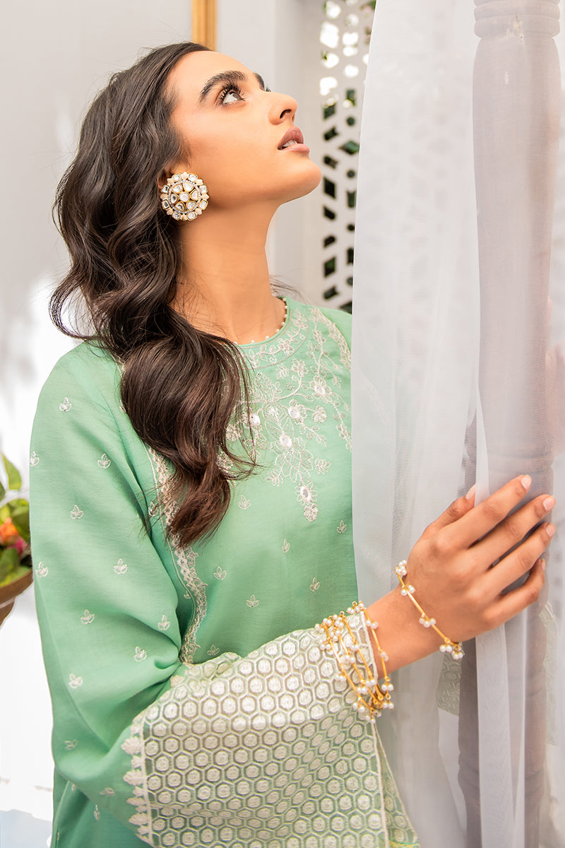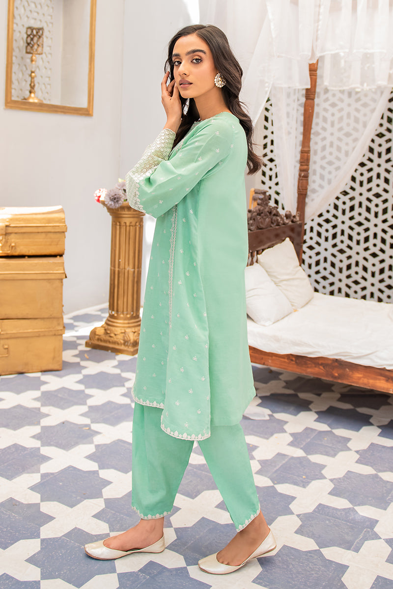 - A minty green ensemble to serenade your festive summer rendezvous crafted on textured lawn. The paneled embroidered kurta is paired with tapered shalwar with embroidered borders. Style with plain khussas and traditional studs.