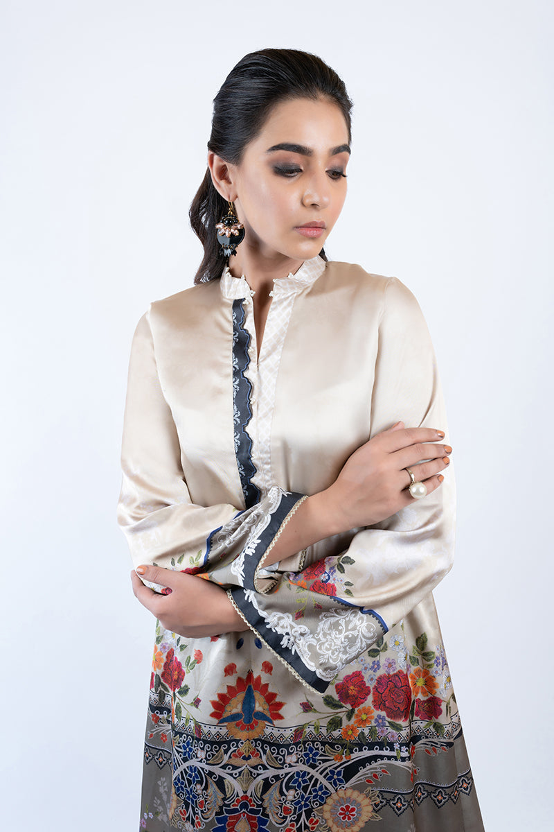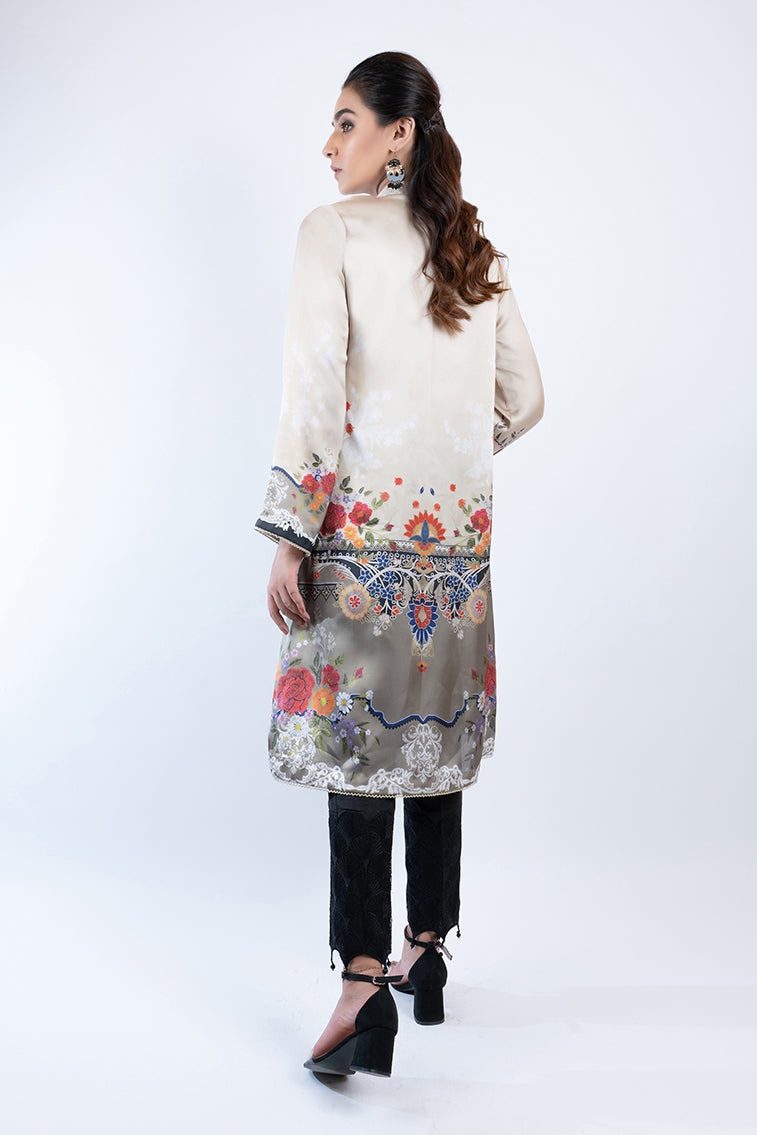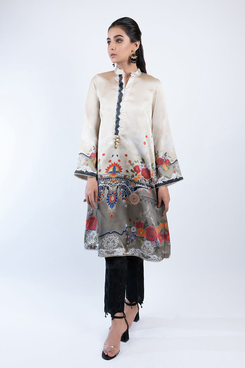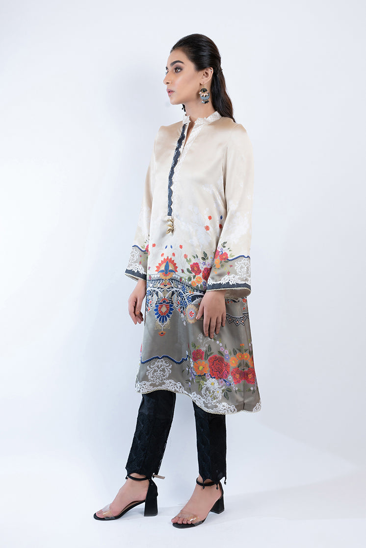 Stand Ban Collar with Slit, Full Sleeves, Digital Printed, Buttons on Neckline, Lace Details on Cuff and Hem