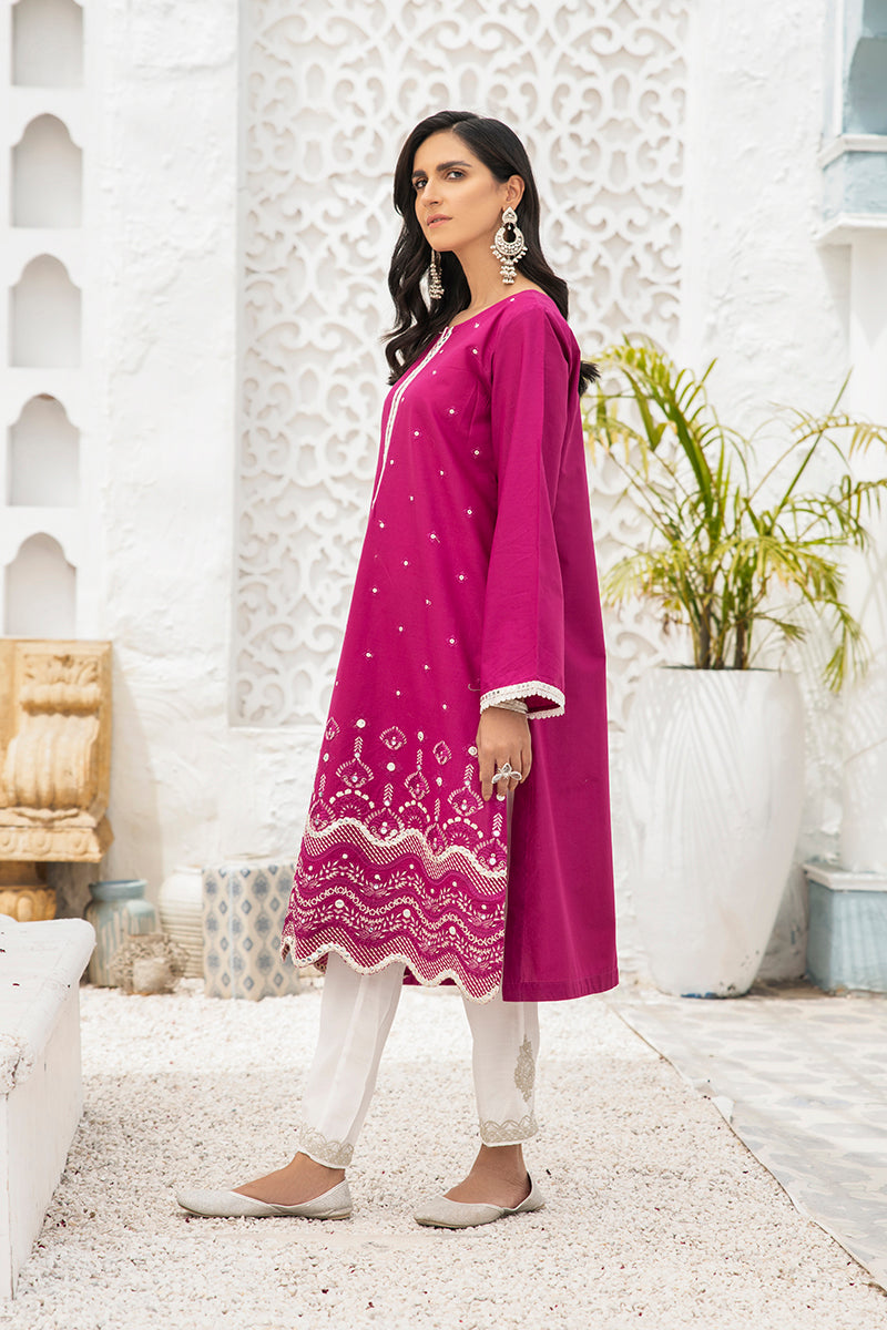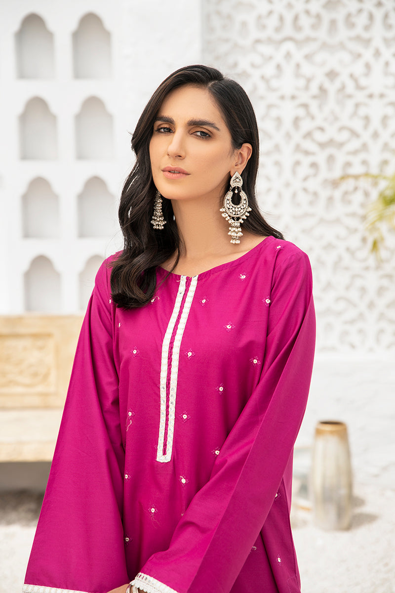 This Embellished Magenta Cambric Number with Embroidered White Details is a Must-Have Kurta For Evening out. Pair With Culottes and Beach Waves