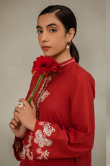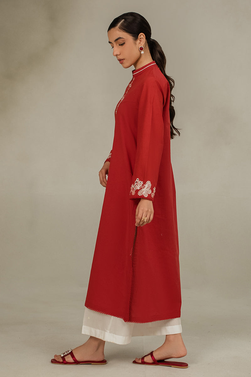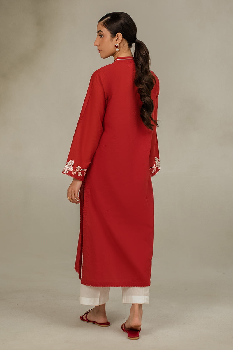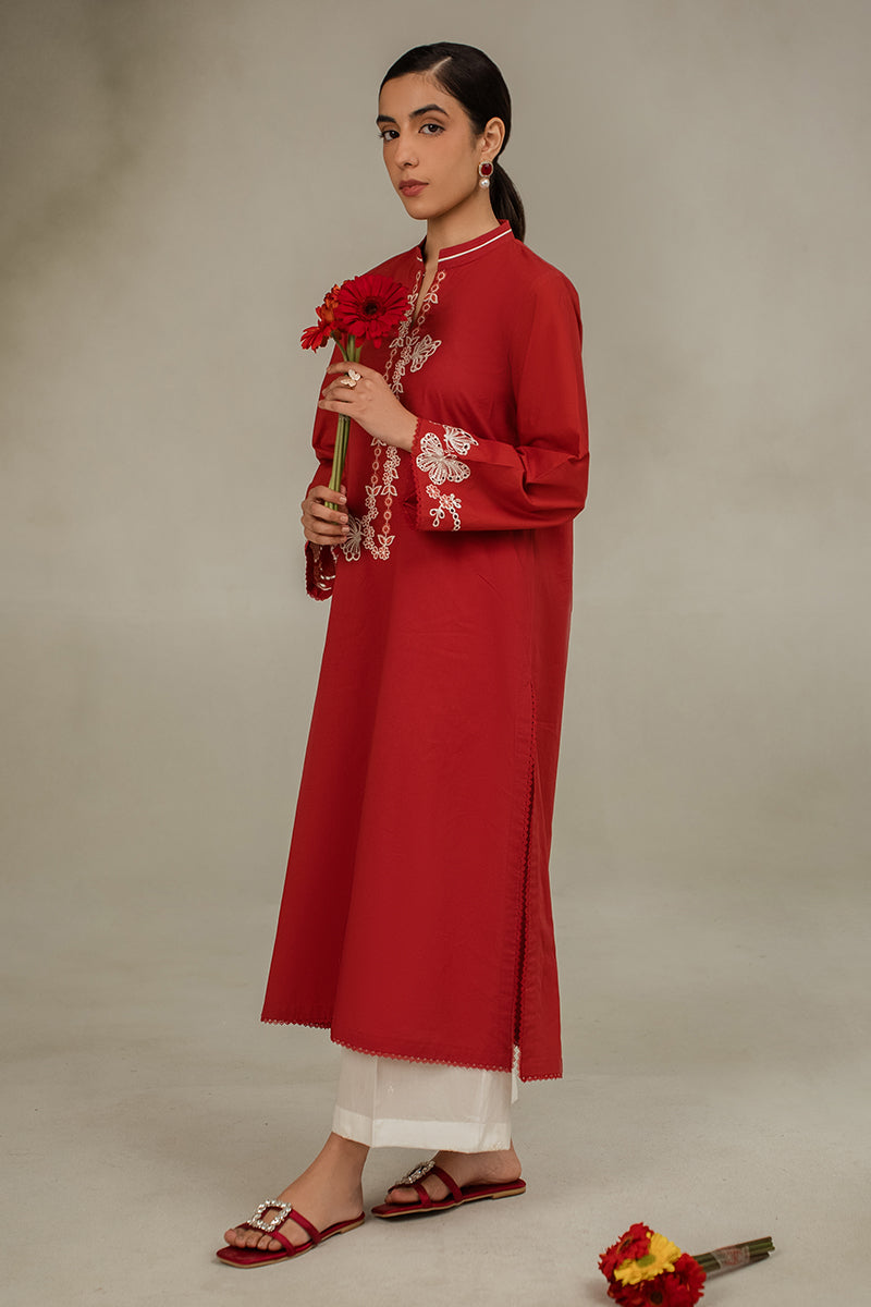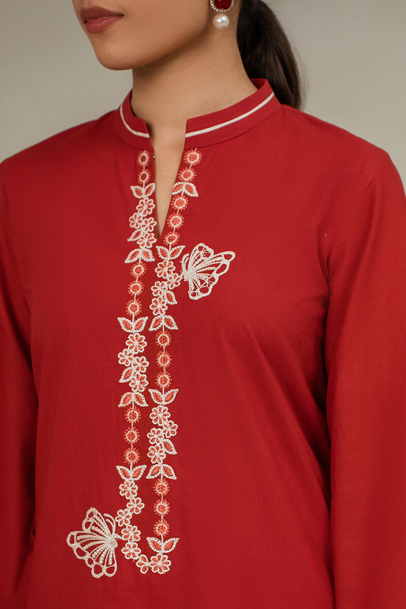 - Discover elegance and sophistication with our CINNABAR RED straight shirt in lawn fabric. The front features intricate embroidery and delicate lace detailing, while the back is kept simple with a plain dyed design. The band collar neck and embroidered sleeves add a touch of glamour to this timeless style.