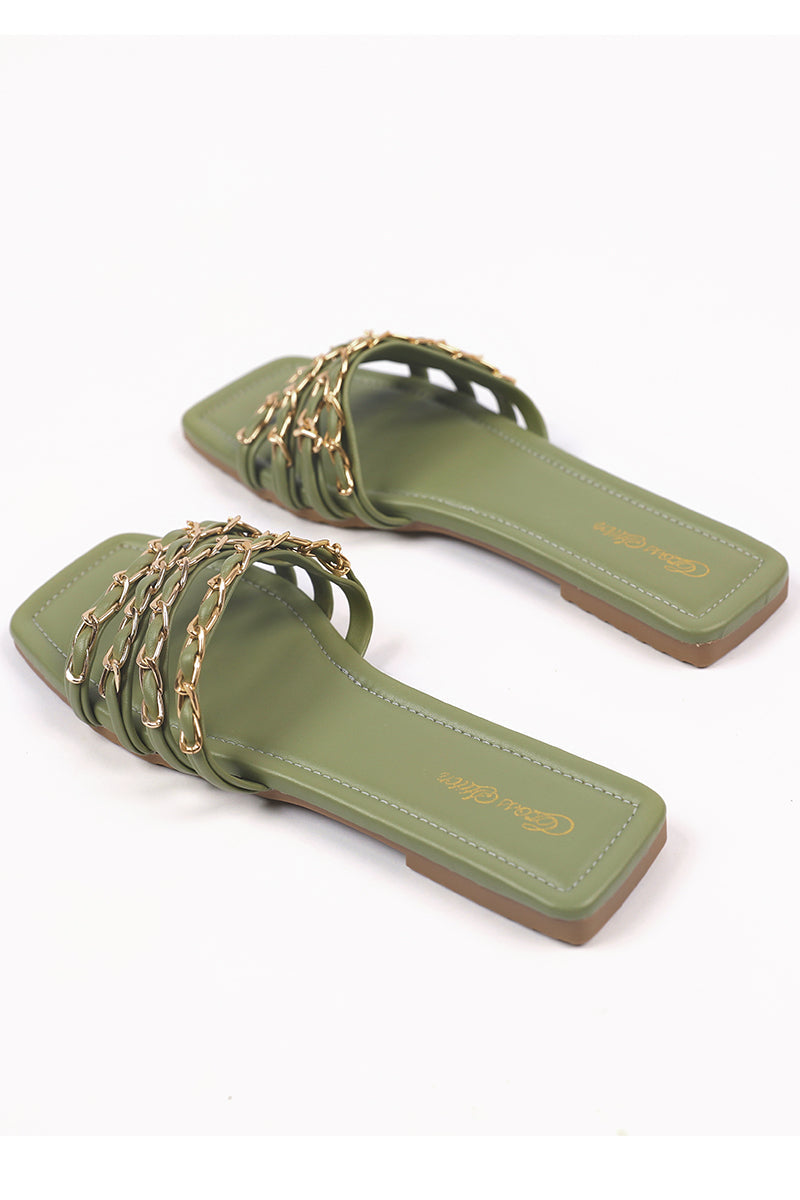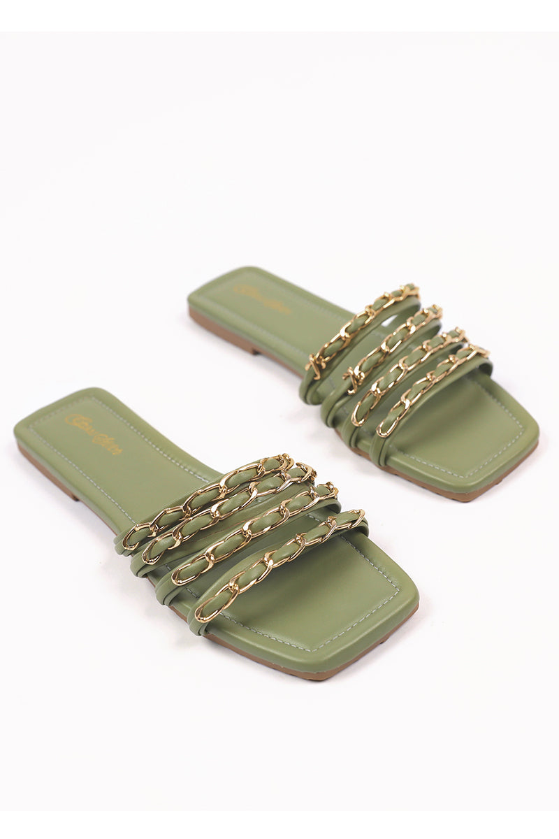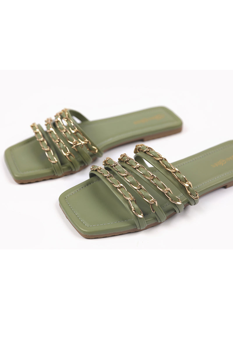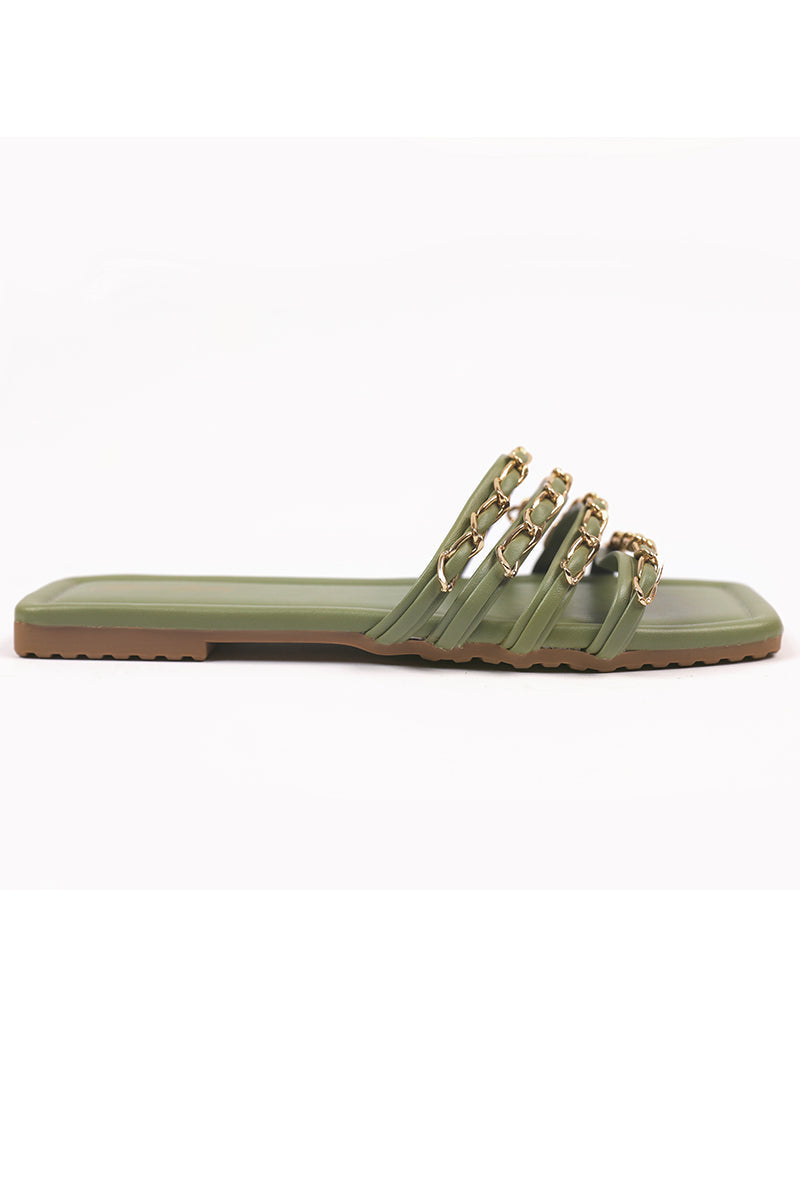 - Olive green chain straps on a matching matte base, perfect to complete any essential look