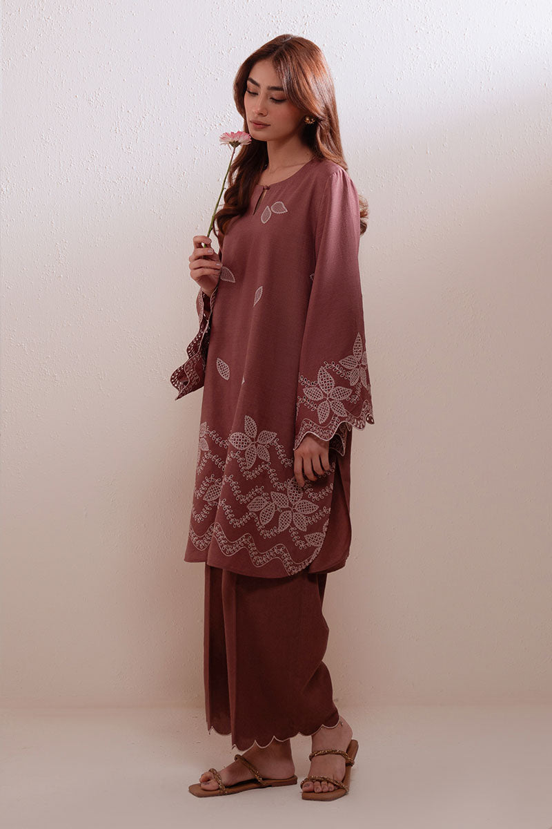 Elevate your wardrobe with the COCO BLOOM two-piece ensemble, expertly crafted for contemporary style. The short boxy shirt features textured lawn fabric with intricate front and sleeve embroidery on a dyed base, complemented by a crew neckline with subtle slit detailing. The coordinating dobby-dyed trouser showcases refined scallop finishing, creating a polished silhouette. This thoughtfully designed set balances modern tailoring with traditional craftsmanship, perfect for occasions demanding both sophistication and distinctive flair.