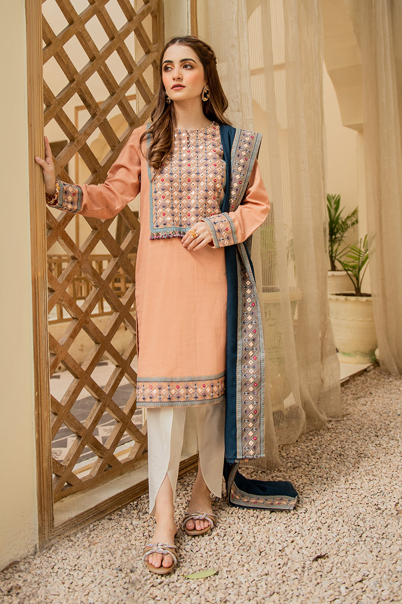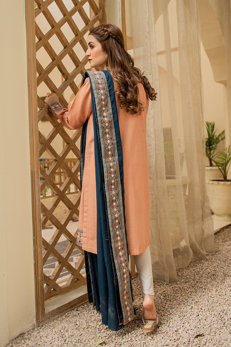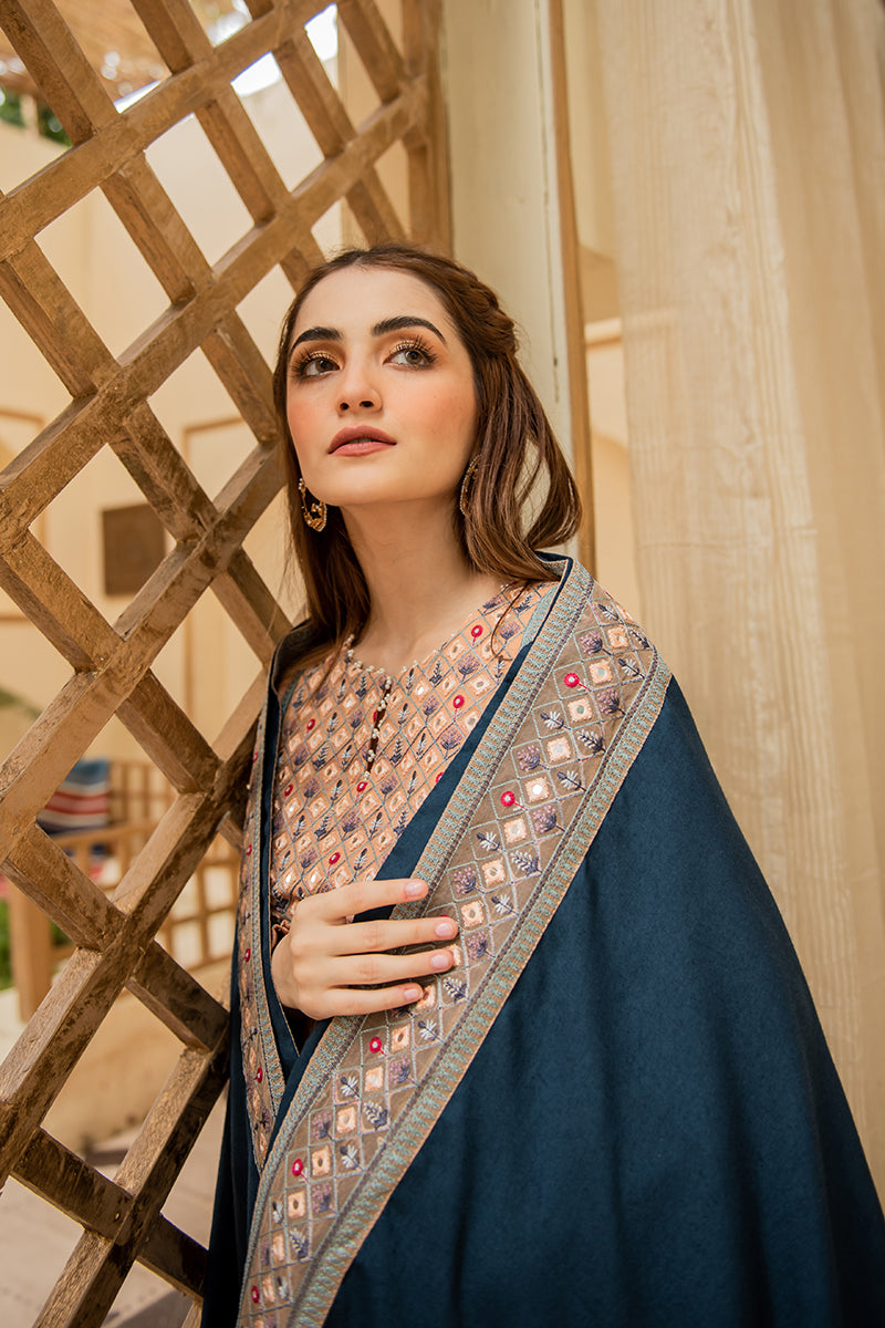 KHADDAR STRAIGHT KURTA WITH EMBROIDERY AND EMBELLISHMENT DETAILS ON NECKLINE AND SHAWL WITH SHEESHA EMBROIDERY BORDERS
