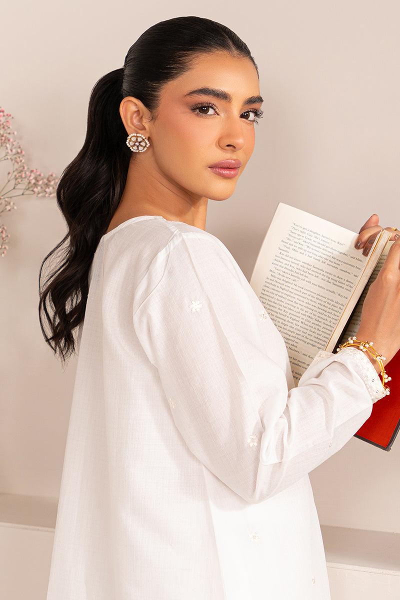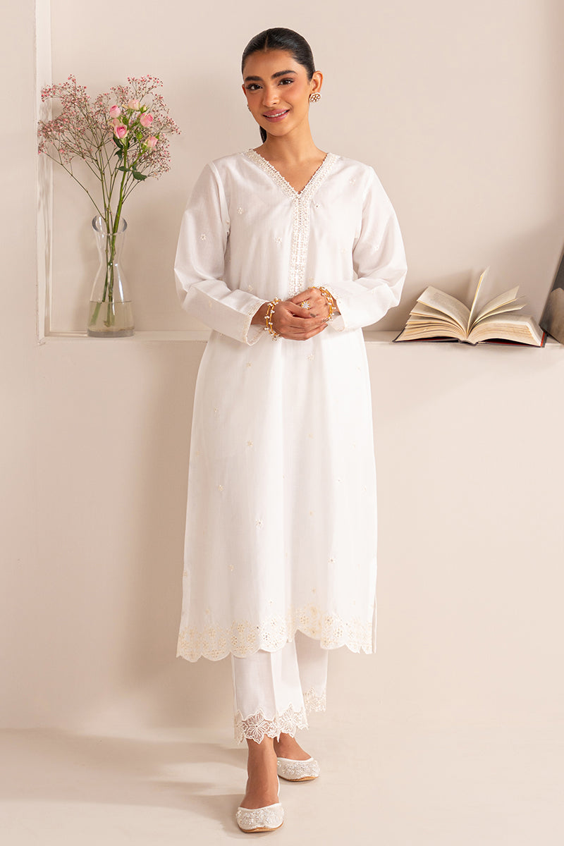 - Introducing our exquisite CRYSTAL CASCADE 2-piece embroidered lawn suit. Made from a lightweight dobby lawn fabric, this elegant a-line suit features intricate front embroidery and a v-neckline with exquisite pearl detailing. The straight embroidered sleeves are complemented by dobby lawn box pants, making this a perfect choice for any occasion.