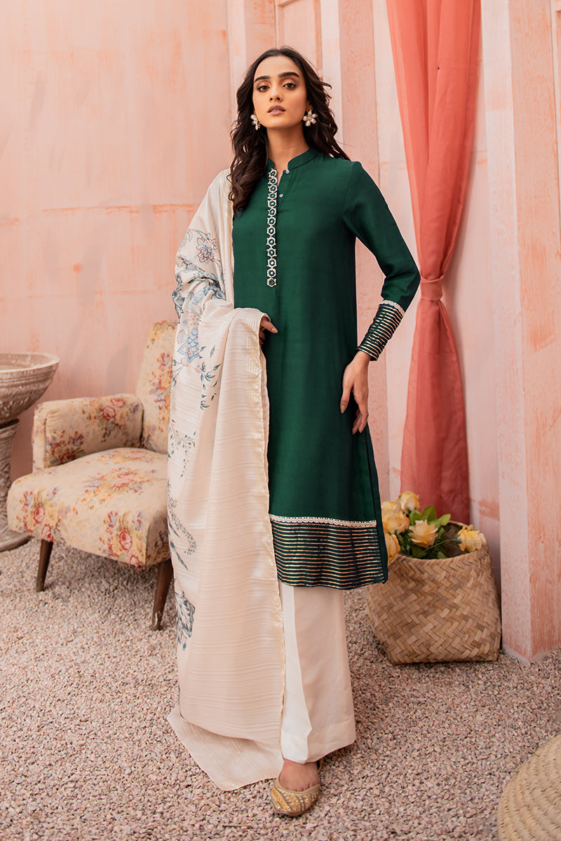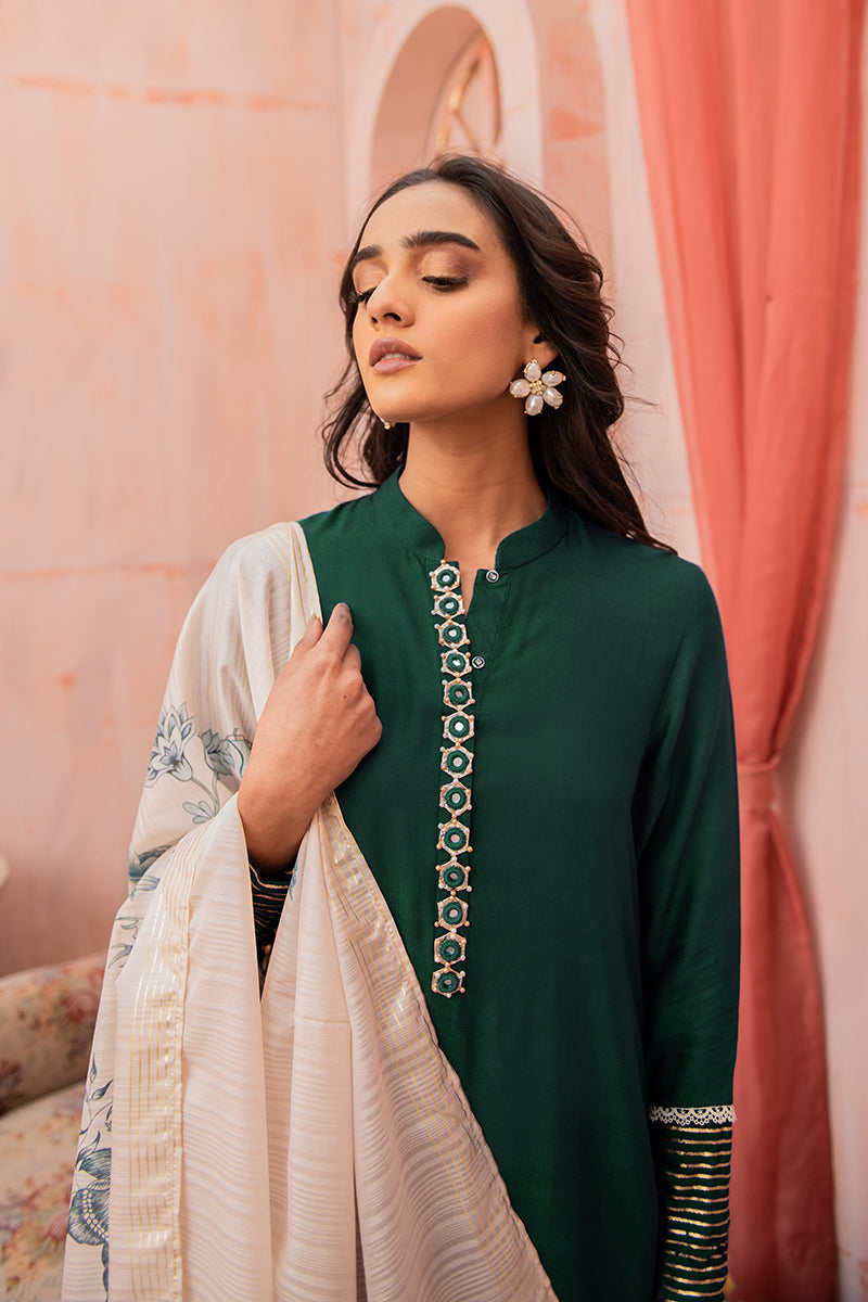 - Paired with the jewel toned shirt is an exquisite printed dupatta.