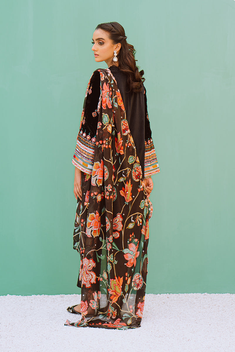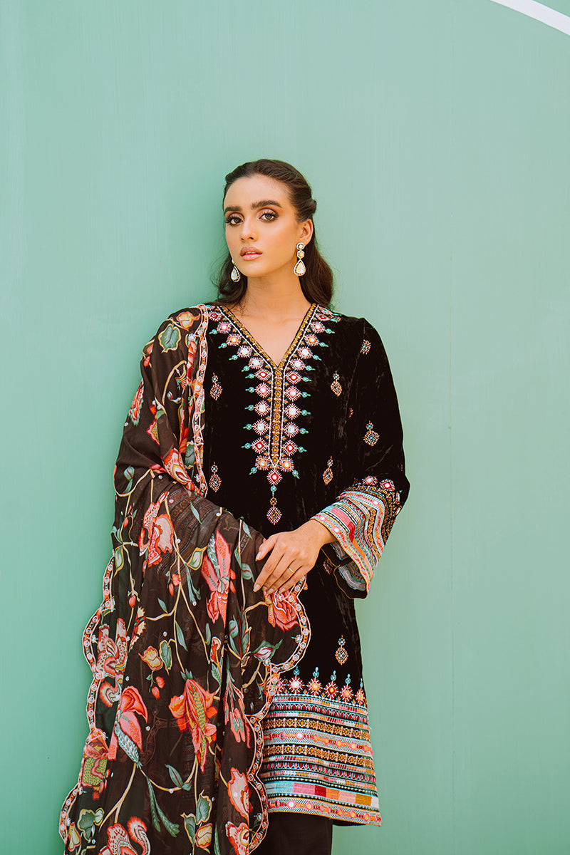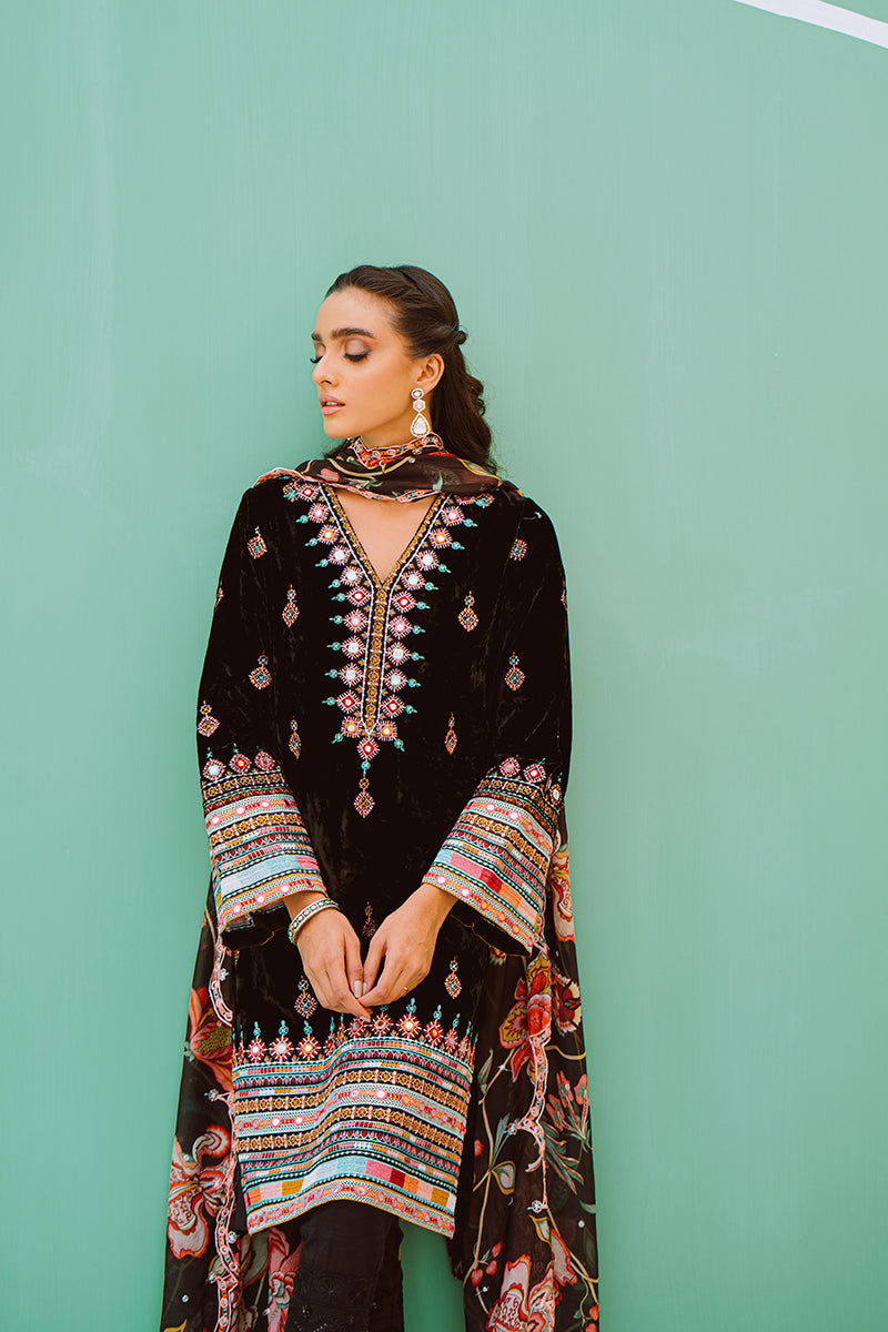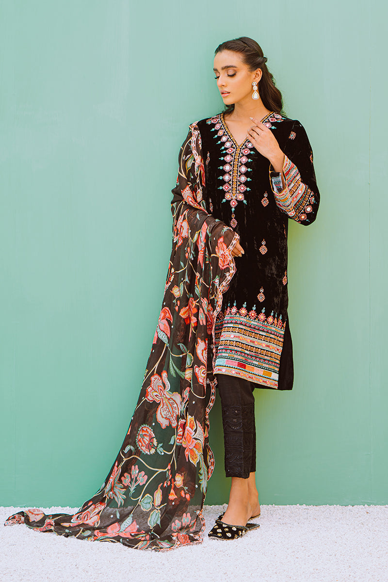 Gracefully Embroidered Velvet Shirt with Faux Mirror Embellishments Paired with a Printed Organza Dupatta with Scalloped Edges. The Two-Piece can be Worn with Balck Cigarette Pants and Khussas